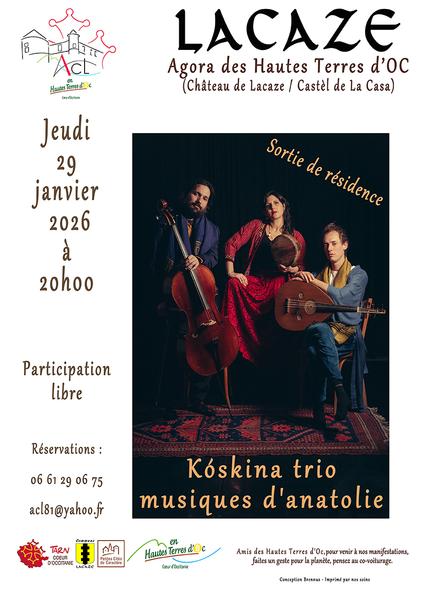 Le trio Kóskina travaille une matière venue des sillons de l’Anatolie. Airs longs de Turquie, danses d’Anatolie, lamentations kurdes, chants ottomans, sirventés occitans dans la tradition des troubadours.