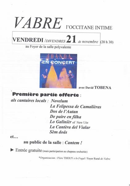 Concert de musique occitane de Joanda avec David Tobéna organisé par Pèire Thouy et le Foyer Rural de Vabre