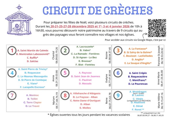 Pour préparer les fêtes de Noël, plusieurs parcours des crèches dans le Tarn vous sont proposés. Vous pourrez découvrir notre patrimoine au travers de 9 circuits qui au gré des paysages vous feront connaître nos villages et nos églises.