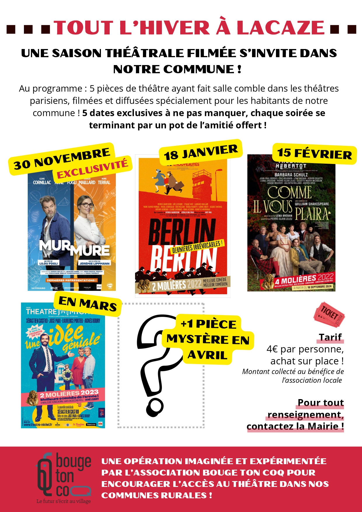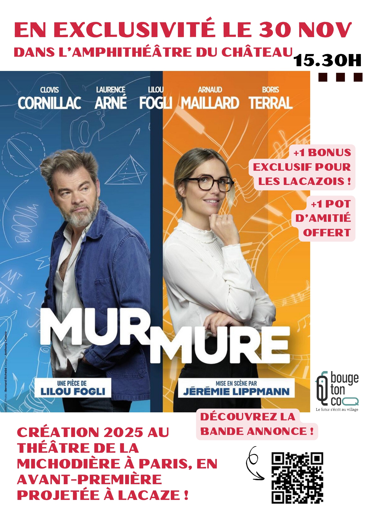 Une saison théâtrale filmée s’invite dans notre commune ! La première pièce diffusée : « Mur Mure » une comédie romantique de Lilou Fogli, mise en scène par Jérémie Lippmann avec Clovis Cornillac, Laurence Arné, Lilou Fogli, Arnaud Maillard et Boris Terral.