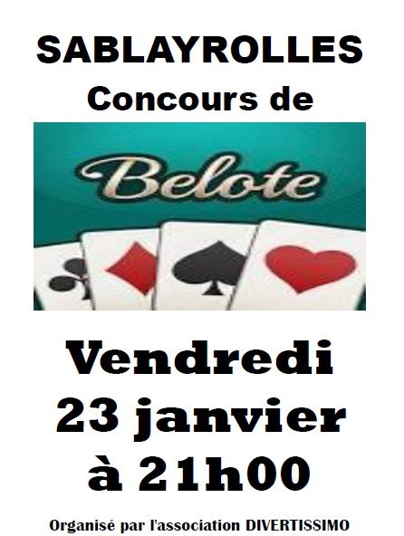 Un concours de belote organisé par l’association Divertissimo. On vous attend nombreux !! Un moment convivial pour tous les amateurs de cartes.