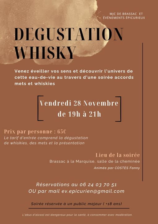 Envie d’éveiller vos sens et découvrir l’univers du whisky ? Rendez-vous à la salle de la cheminée, pour une soirée accords mets & whiskies animée par l’intervenante de la Mjc Fanny Costes.