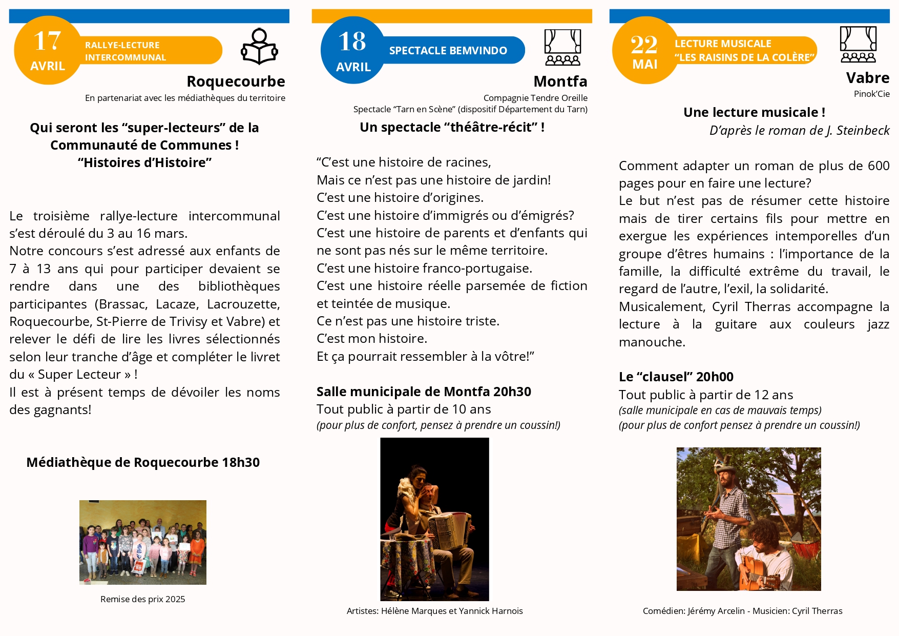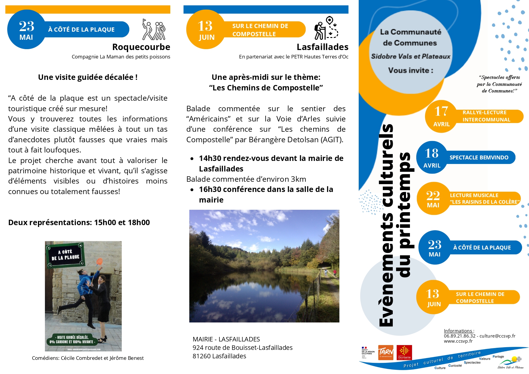 Dans le cadre du projet culturel de territoire, la Communauté de Communes Sidobre Vals et Plateaux vous invite aux évènements culturels du printemps avec plusieurs spectacles d’avril à juin. Dernier événement, balade commentée suivie d’une conférence.