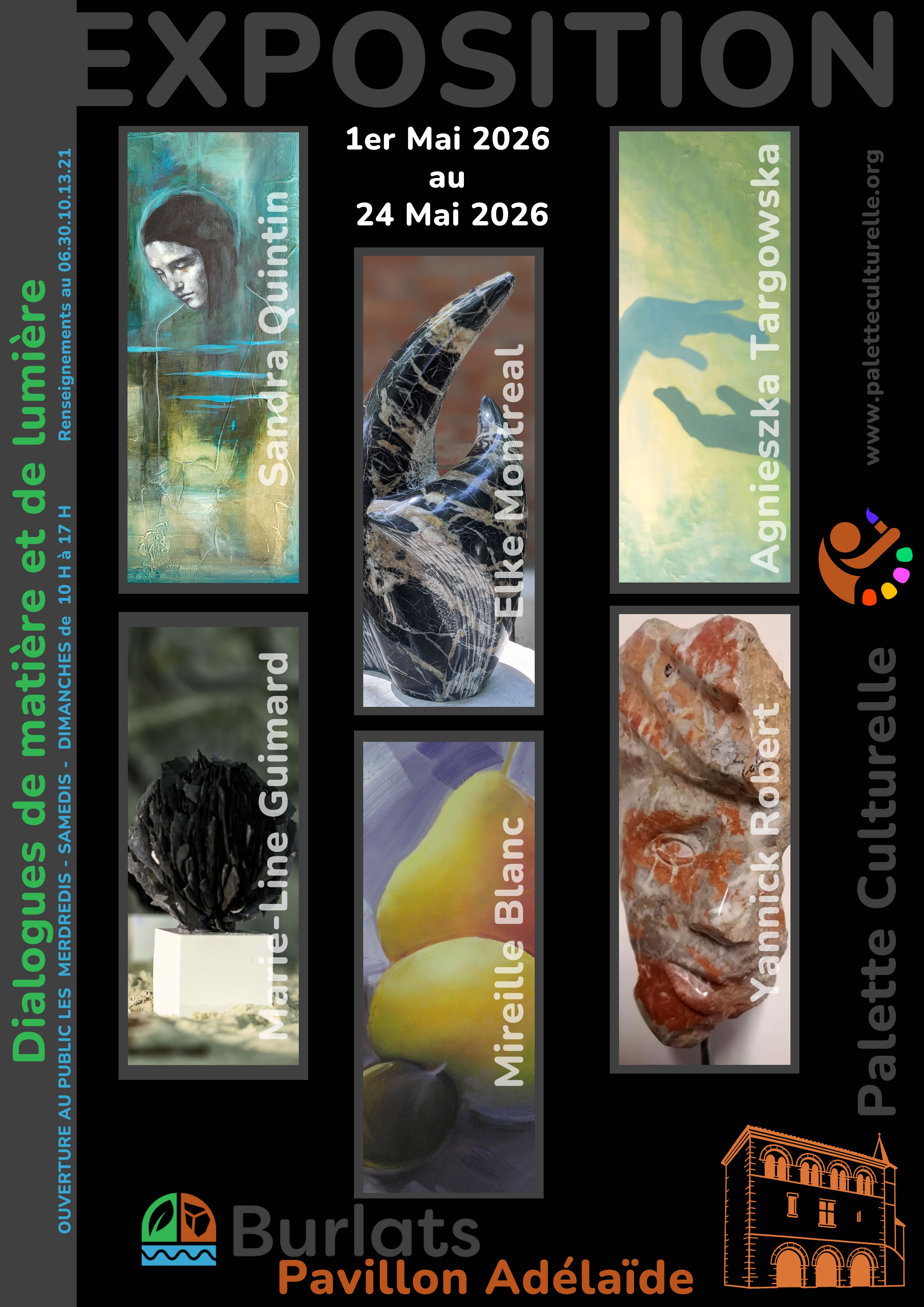Réunissant les artistes Mireille Blanc, Marie-Line Guimard, Elke Montreal, Sandra Quintin, Yannick Robert et Agnieszka Targowska cette exposition explore les liens entre peinture, sculpture et jeux de lumière, dans une approche sensible et contemporaine.