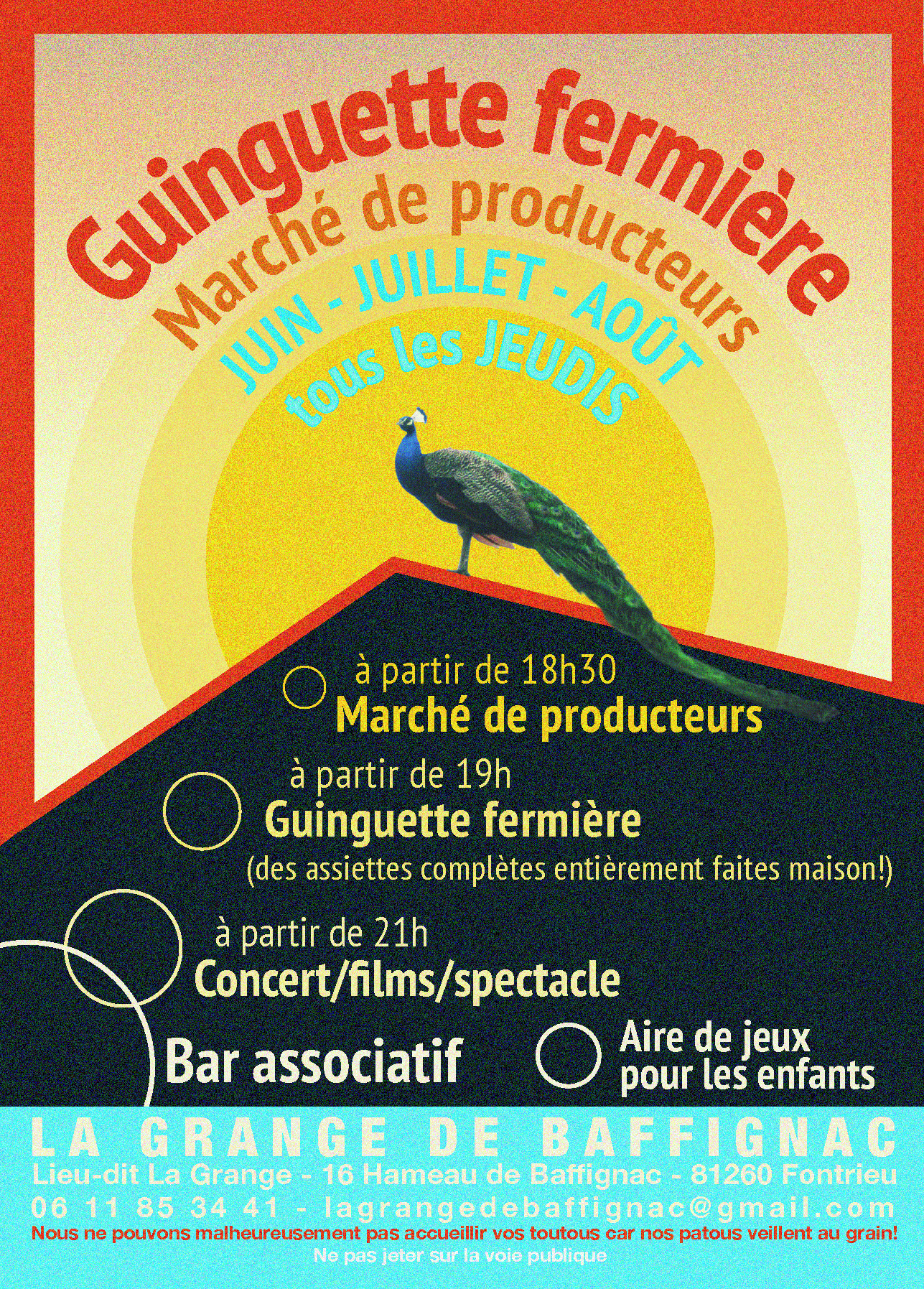 Dès 19h, guinguette fermière avec des produits de la ferme la Grange de Baffignac et des produits locaux. Des assiettes entièrement faites maison !
