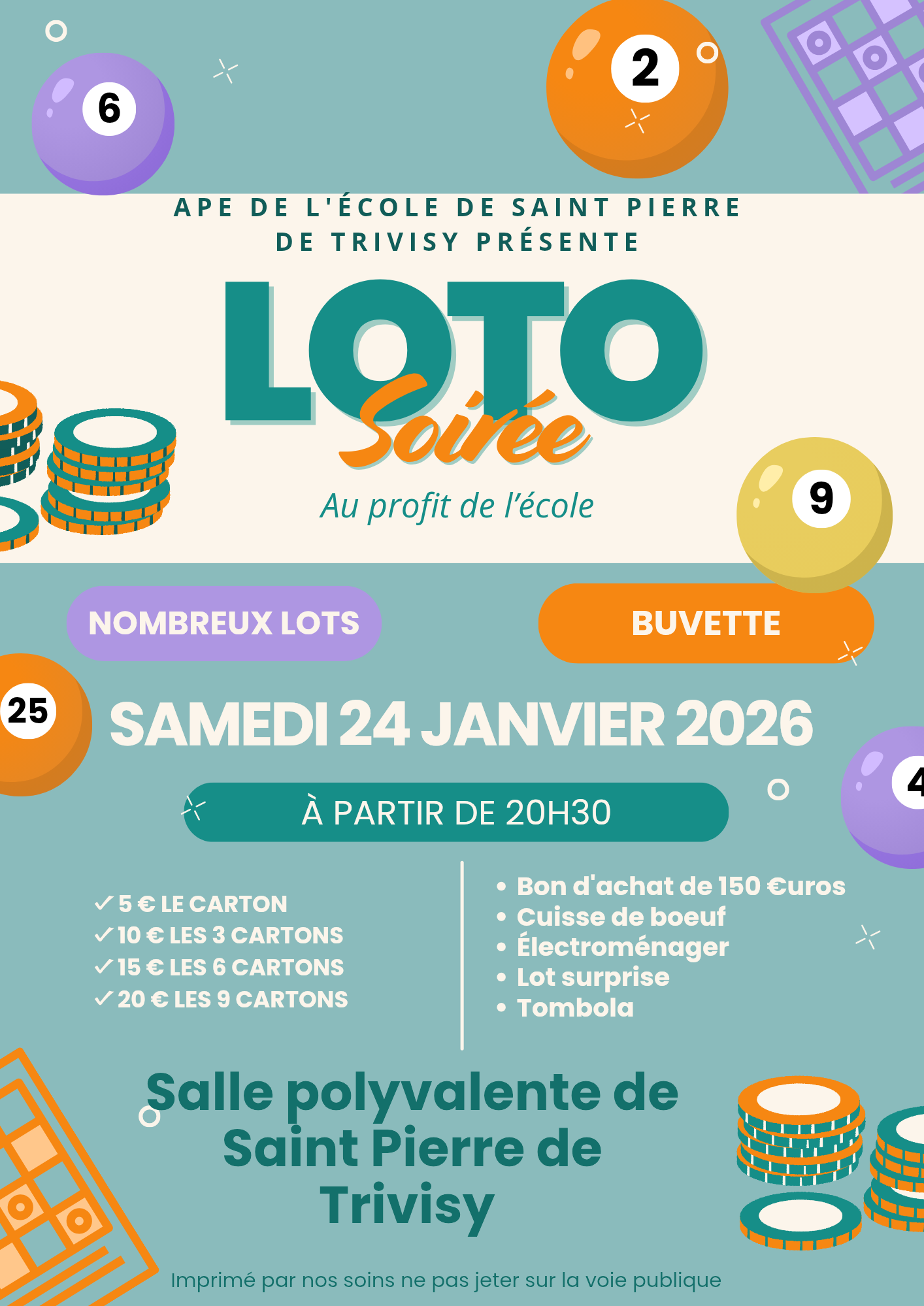 Une soirée loto, organisée par l’APE, au profit de l’école de Saint-Pierre de Trivisy. Nous vous attendons nombreux !