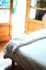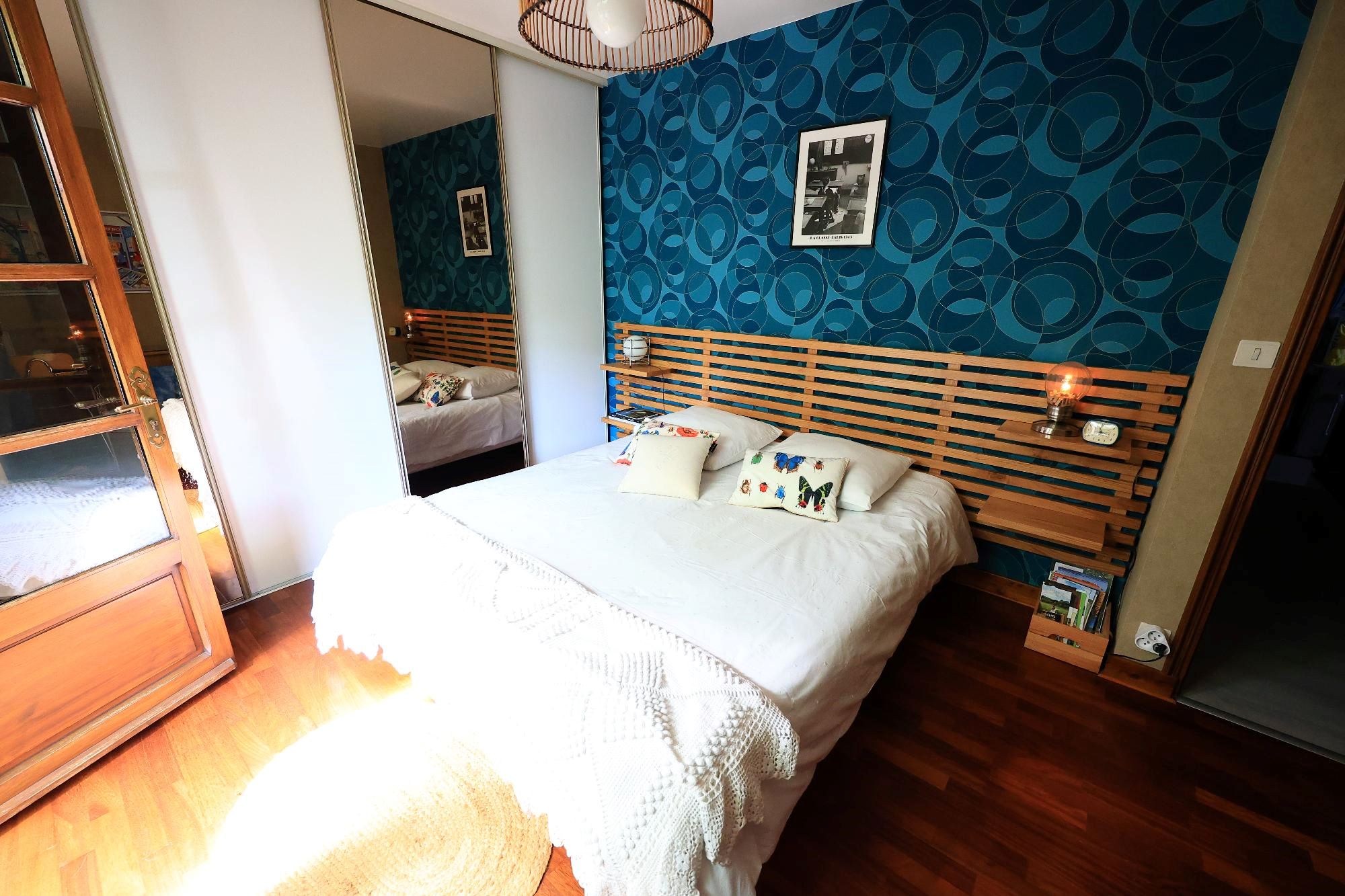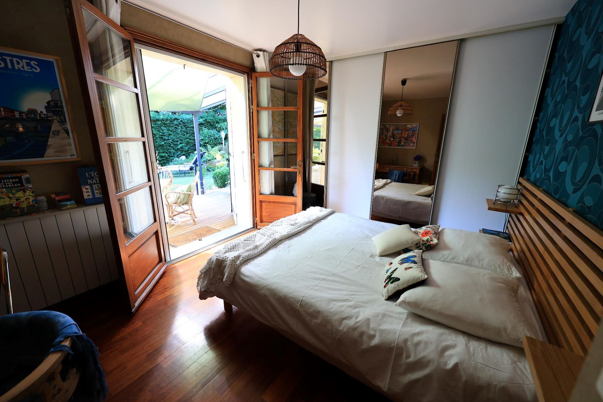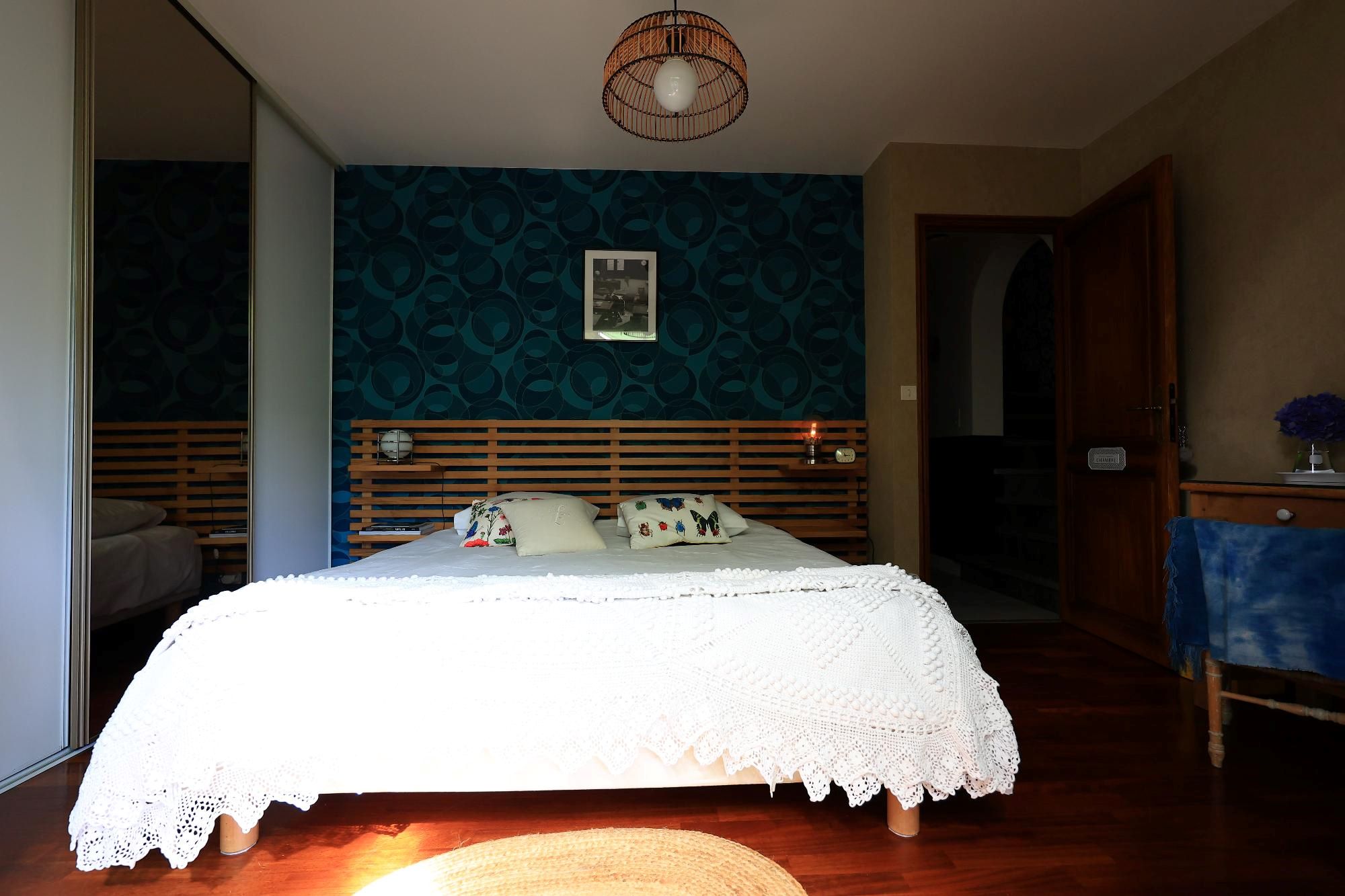 Chambre cosy, au calme, avec une literie (en 160) très confortable donnant sur une terrasse aménagée et avec vue sur le jardin.