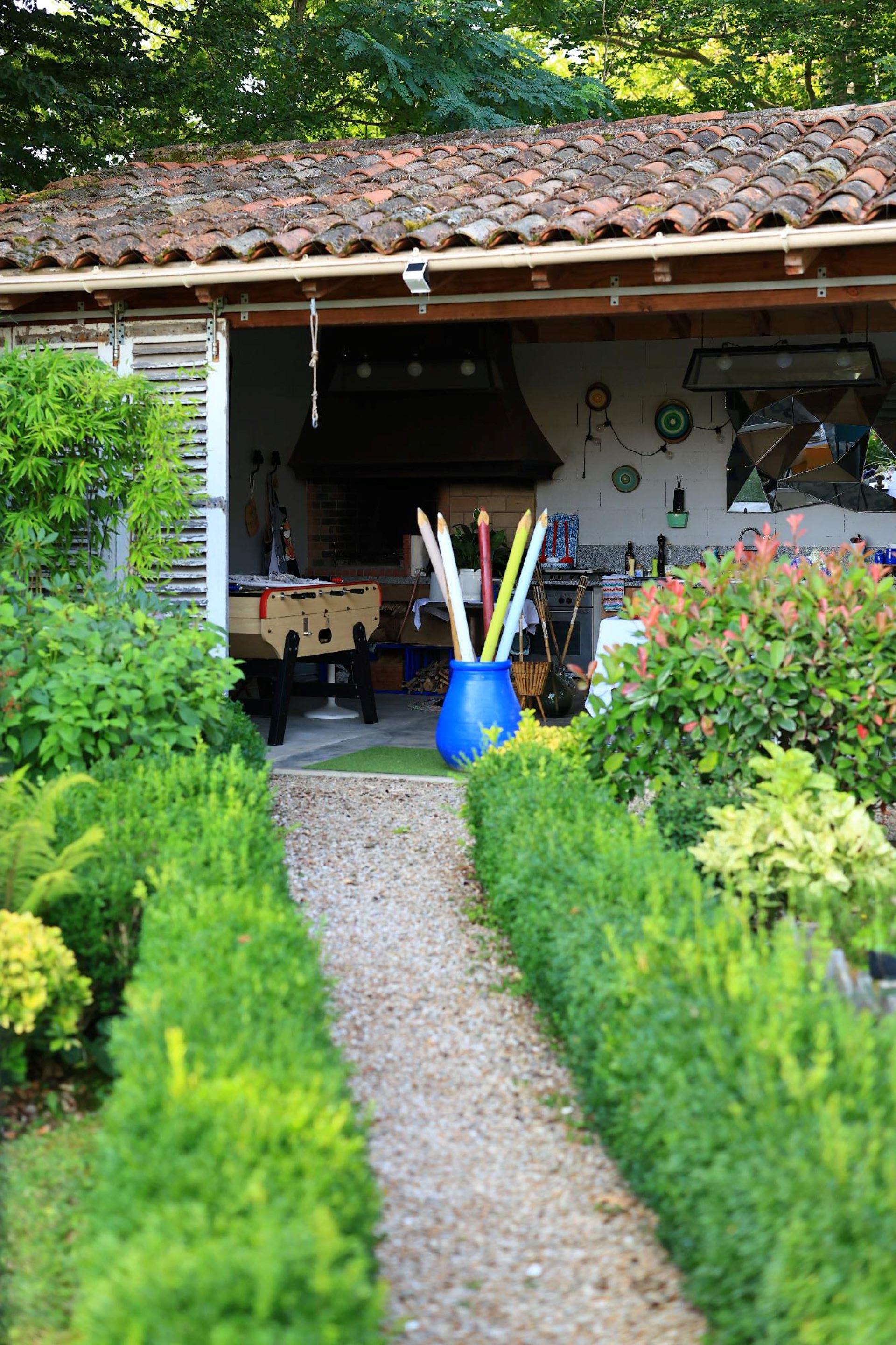 Terrasse avec cuisine d’été et jardin agrémenté de chaises longues, coin repas…
