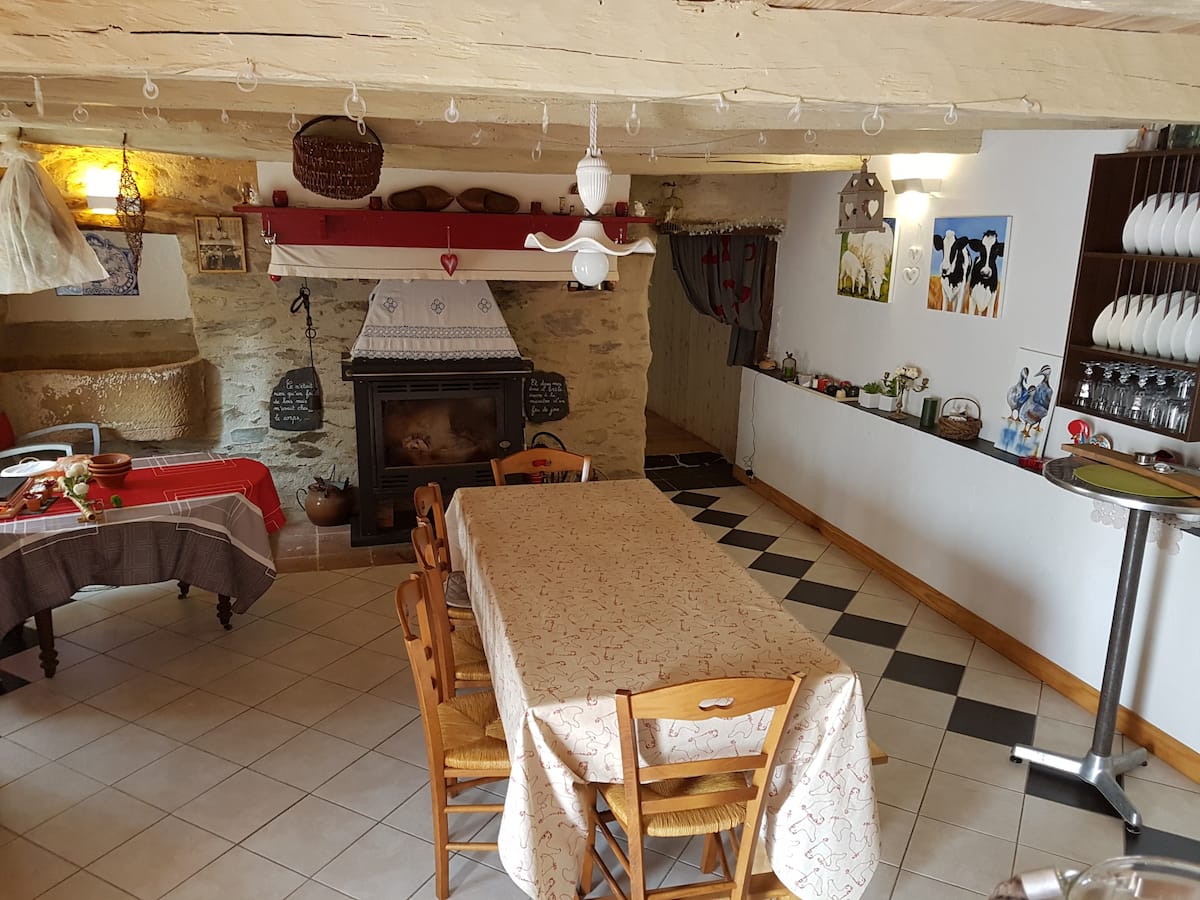 Gîte à la campagne, tout confort, très bien équipé, 6 à 8 personnes. Salle à manger, cheminée, salon, cuisine, 2 salles d’eau, 2 wc, 2 chambres + 1 grand espace à dormir 4 lits (bébé, enfant, 2 lits 130). Barbecue, four à pizza, terrasse ombragée. Parking