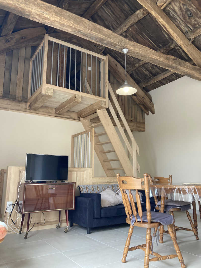 – une grande chambre mansardée, façon dortoir avec deux lits d’une personne 90×190, 1 lit d’appoint 70×190.