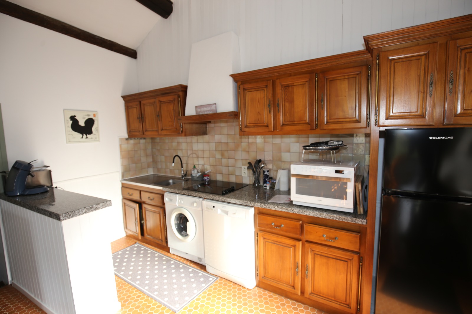 – séjour (table de salon, télévision par satellite, deux canapés, cuisine ouverte toute équipée : lave-vaisselle, réfrigérateur, four micro-ondes combiné, plaque de cuisson, lave-linge, bouilloire, cafetières (traditionnelle et Senseo)