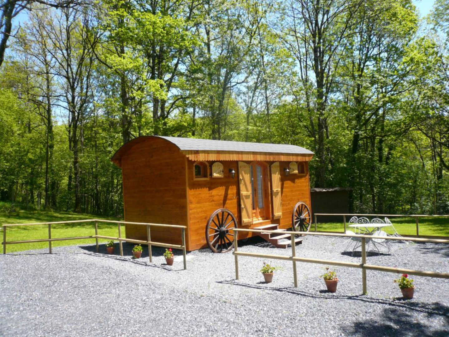 La roulotte champêtre, véritable petite maison en bois, se tient sur le domaine de Vinelle, au milieu d’une clairière. Ne craignez pas d’y être à l’étroit car elle est spacieuse et très confortable.