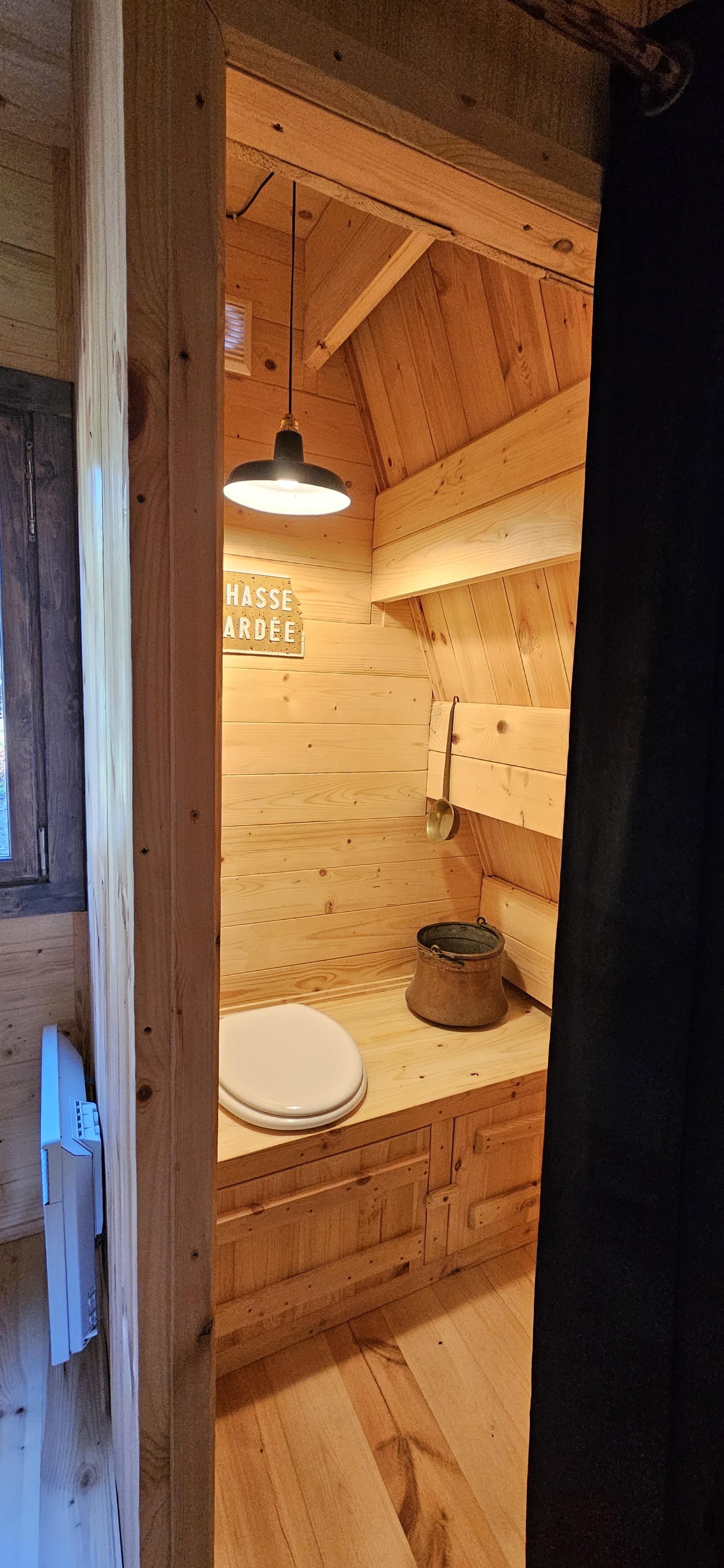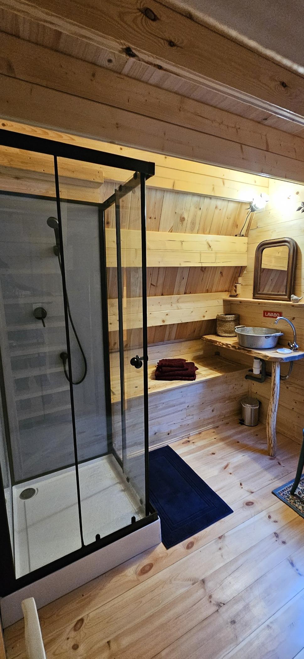 La salle d’eau est pourvue d’une douche. Un système de phyto-épuration traite les eaux usées. Vous trouverez également des toilettes sèches.