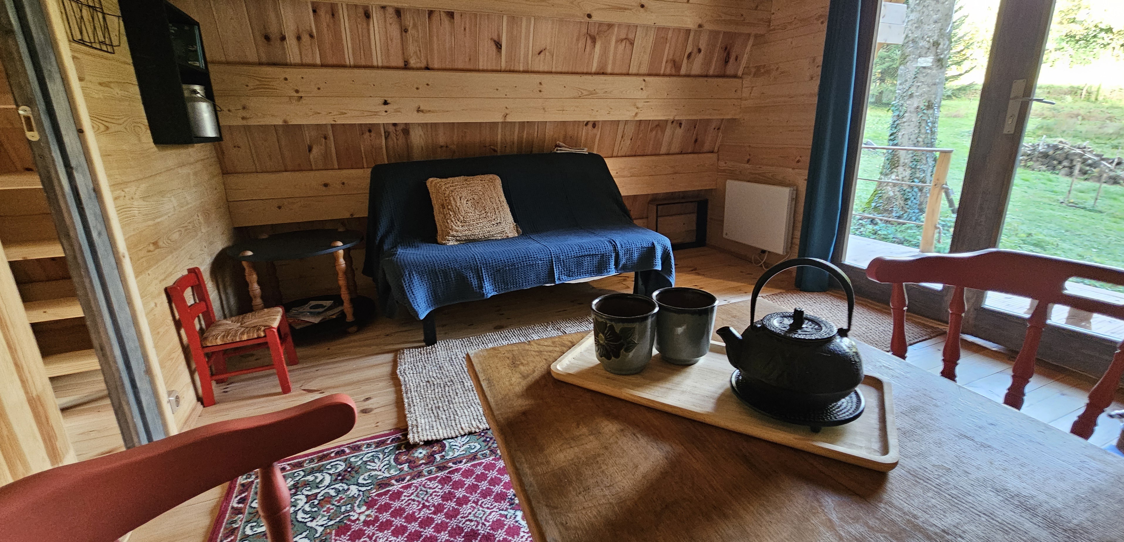 Au petit matin, le petit déjeuner peut vous être livré dans un panier. Vous pourrez le prendre à l’extérieur, bercés par le chant des oiseaux, au pied d’un immense sapin, ou dans la pièce à vivre.
