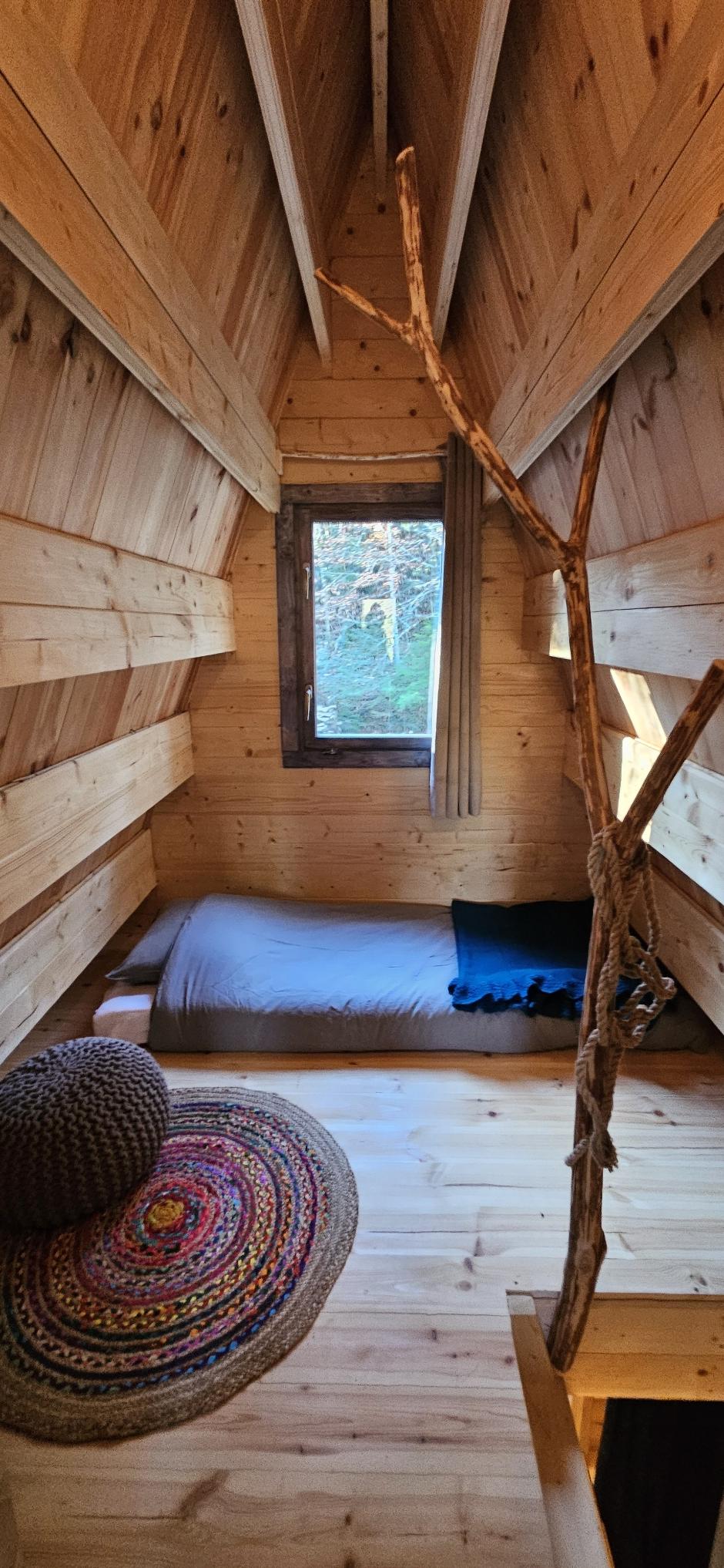 Il est équipé à l’étage (accessible par une échelle en bois) d’un lit 2 places et d’un lit simple, et au rez-de-chaussée d’un canapé convertible. Il peut être chauffé en saison froide.
