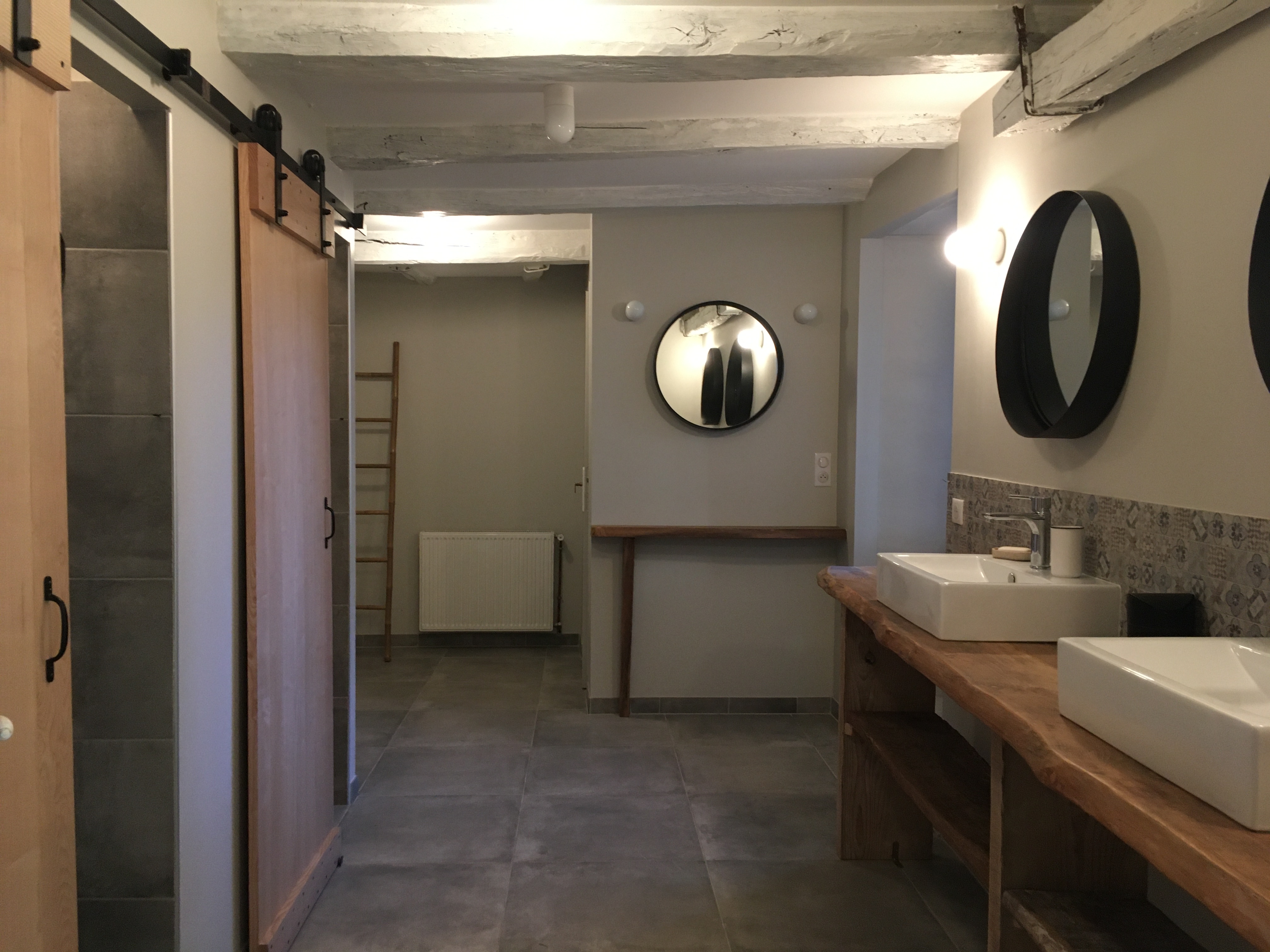 Enfin, une terrasse et deux tables de pique-nique sont disposées sous la pergola pour déjeuner à l’extérieur à la belle saison.