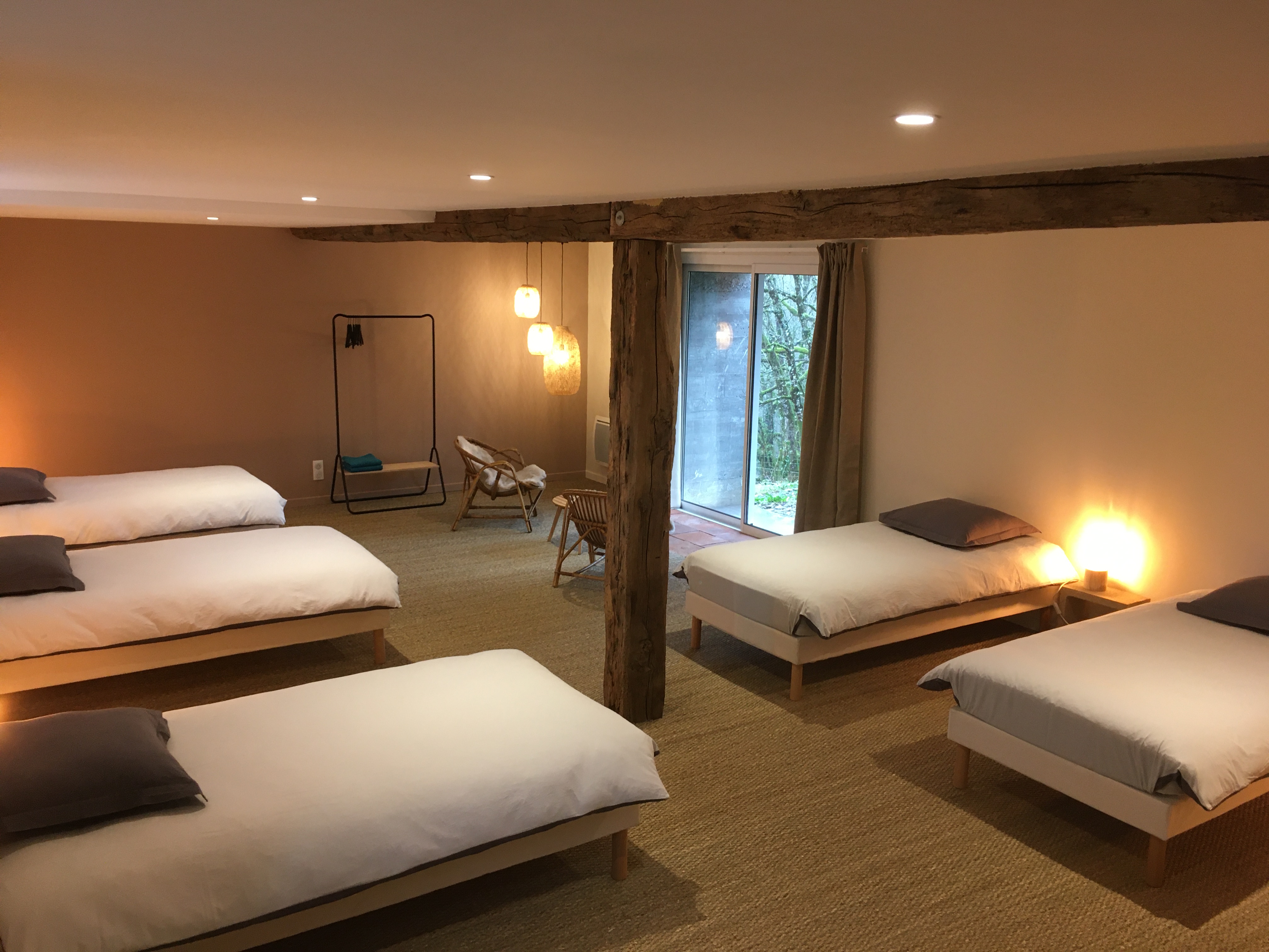 Le Clos des Lucioles est un ancien corps de ferme transformé en centre holistique permettant d’accueillir jusqu’à 15 personnes en pension complète. Le lieu dispose d’une cuisine/ salle à manger collective, d’une salle de sport utilisée pour les cours de Yoga ou autre pratique de bien-être, ainsi que d’une salle de massage. A l’étage des chambres, un salon commun avec un poêle à bois permet de se retrouver en journée ou le soir pour discuter, échanger, lire, etc… La salle de sport/Yoga dispose d’une véranda/salle de lecture faisant face au jardin et arbres fruitiers, où il est possible de se poser, prendre un thé.