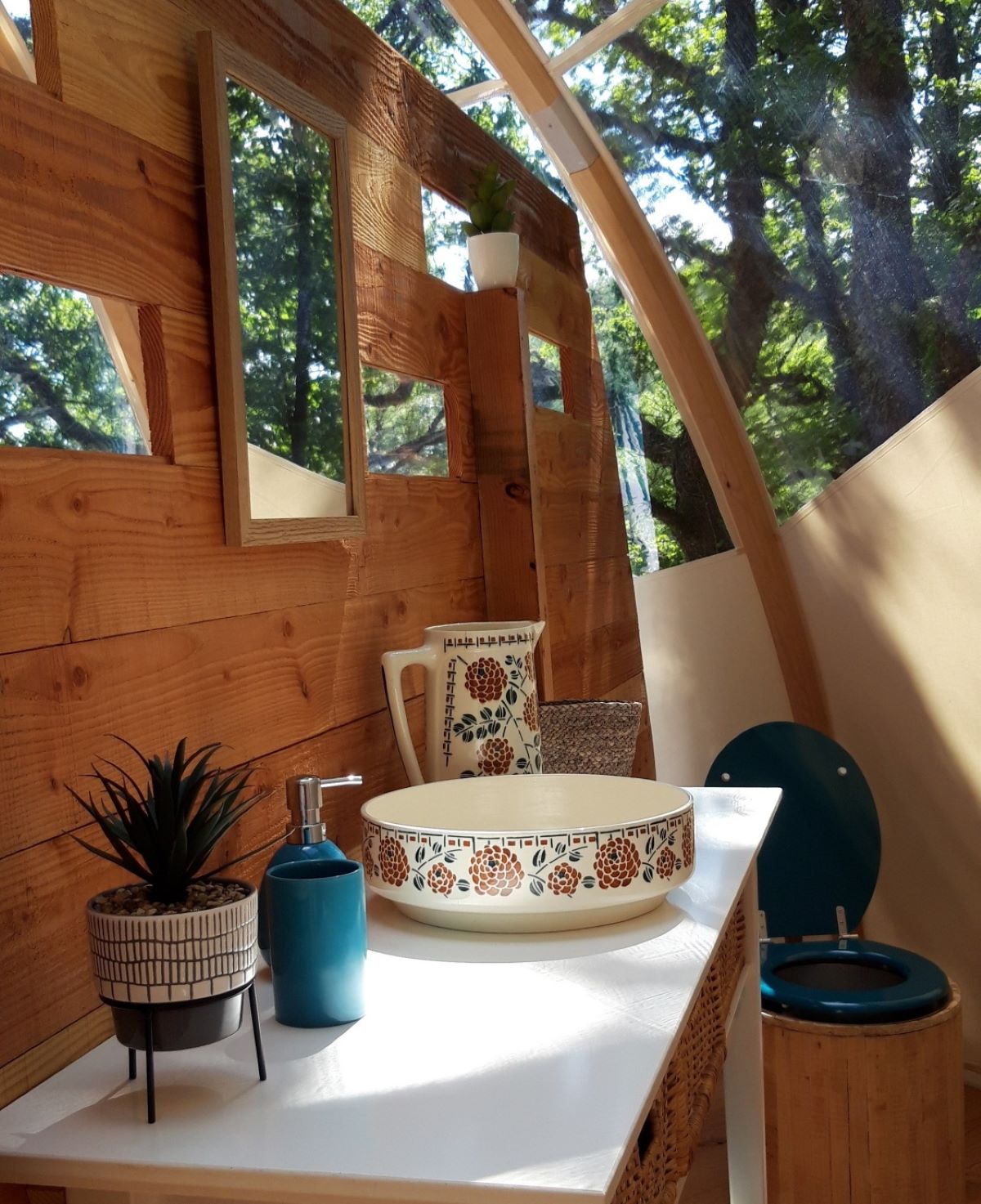 Au – dessous du dôme vous aurez tout le nécessaire pour cuisiner et à proximité vous pourrez découvrir une adorable mini roulotte sanitaire.