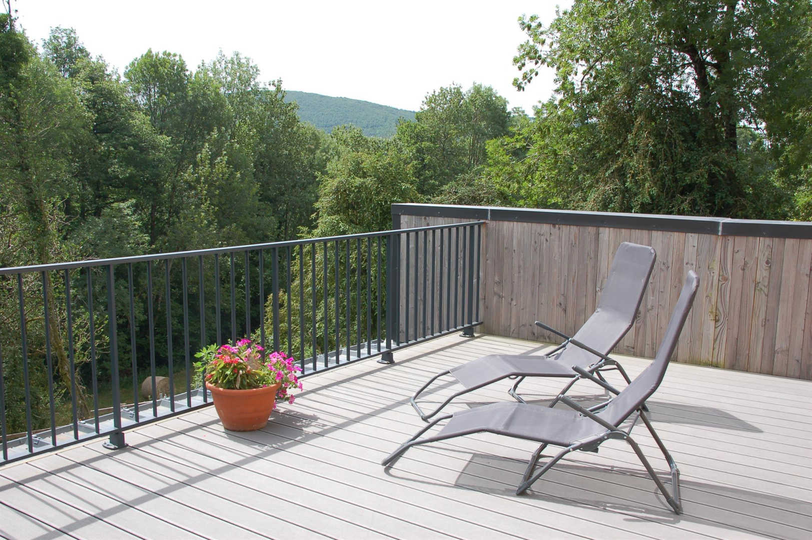 L’étage accueille également une salle d’eau, un wc séparé et une terrasse suspendue offrant une belle vue sur la nature environnante.