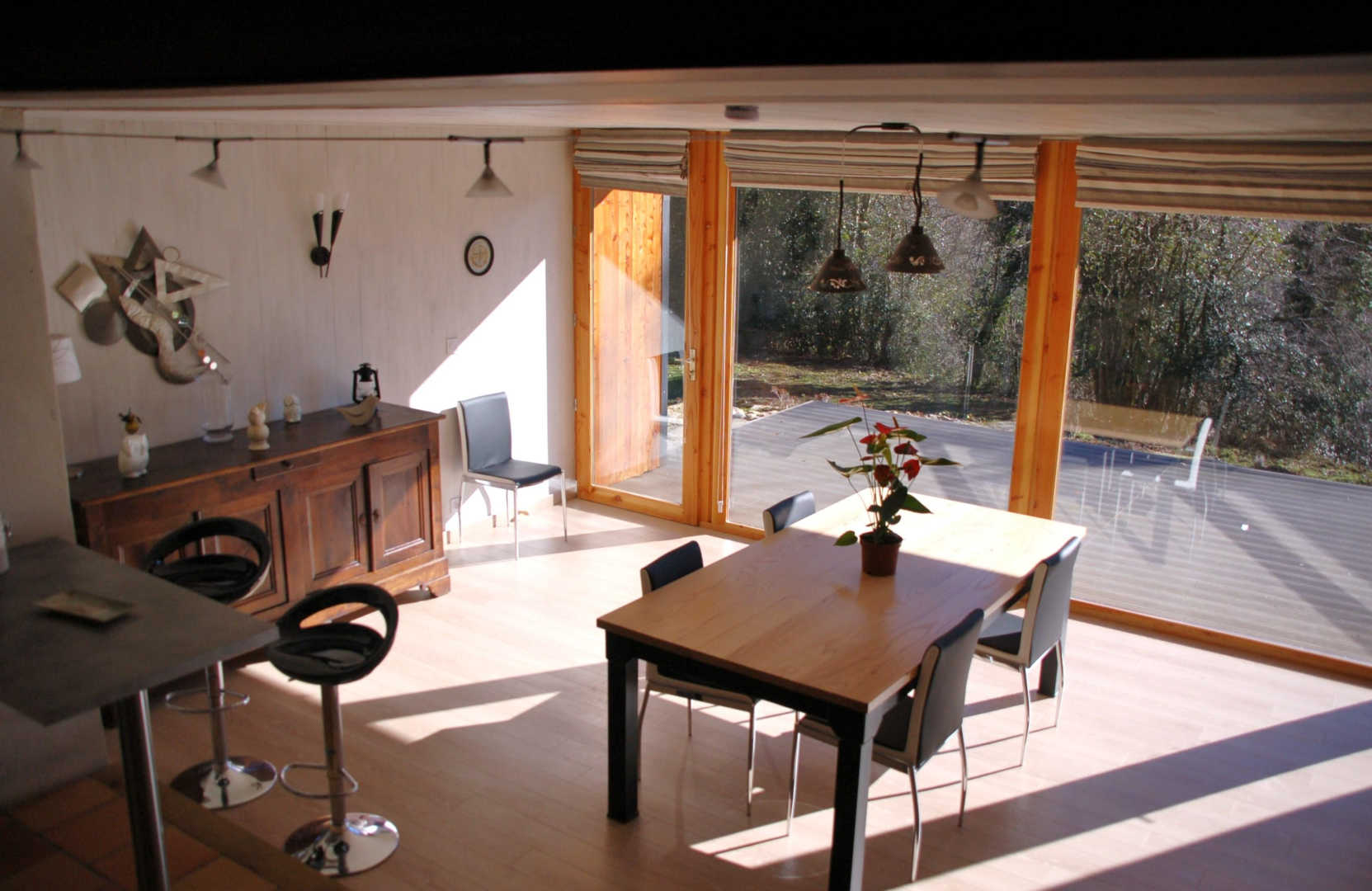 Le rez de chaussée s’organise autour d’un grand séjour ouvert, avec salon et cuisine moderne entièrement équipée (cafetière à filtre et Senséo). L’espace, convivial et fonctionnel, donne directement sur une terrasse en bois et sur le jardin privé, parfaits pour les repas en plein air ou les moments de détente.