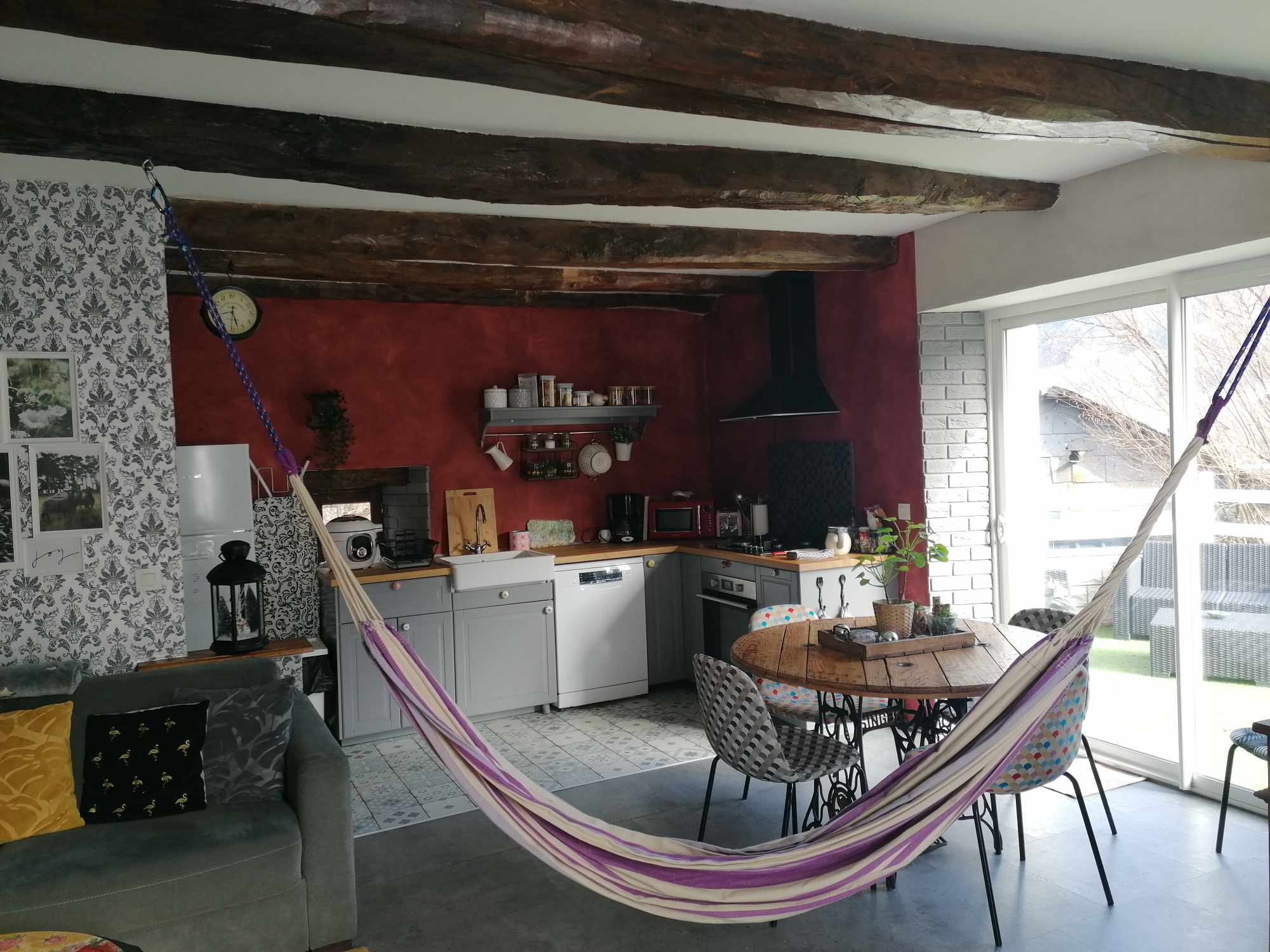 Ground floor: living room with fully equipped open kitchen (fridge-freezer, 4 ring hob, oven, dishwasher, microwave…) and sitting area, opening onto the terrace, toilet. Pellet stove providing a pleasant heat, sofa bed.
