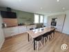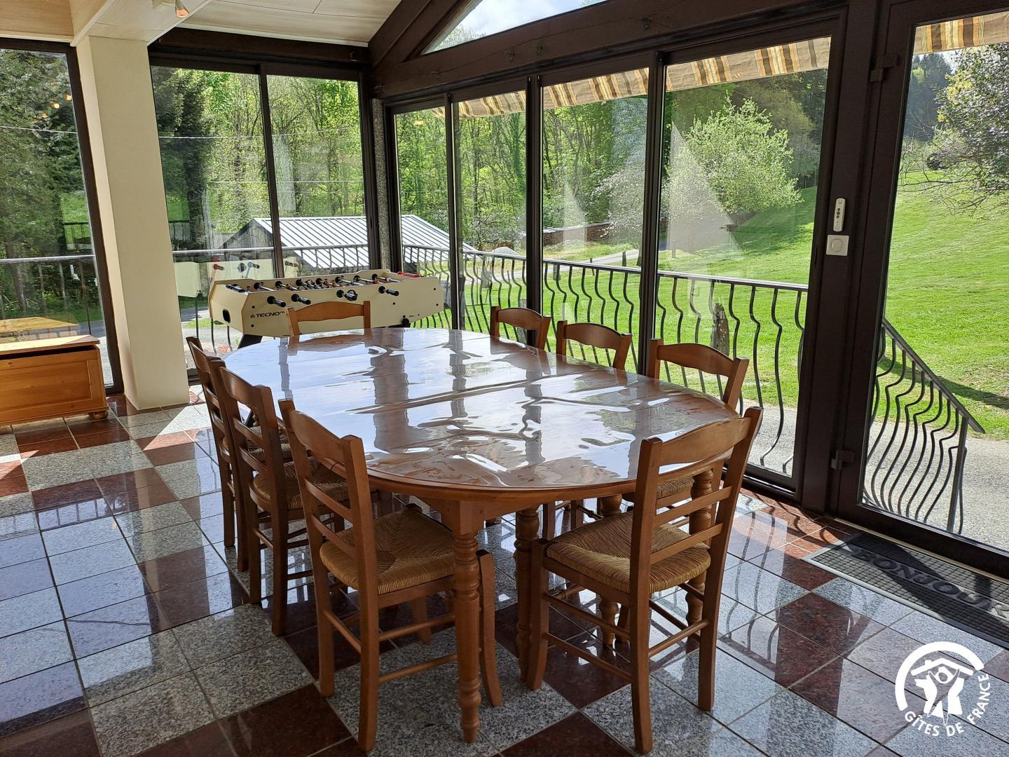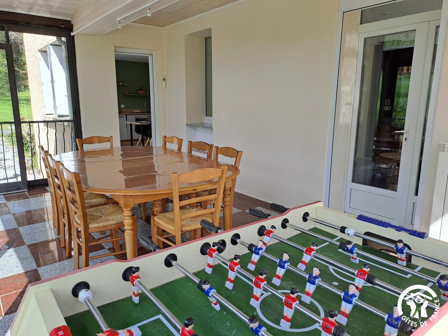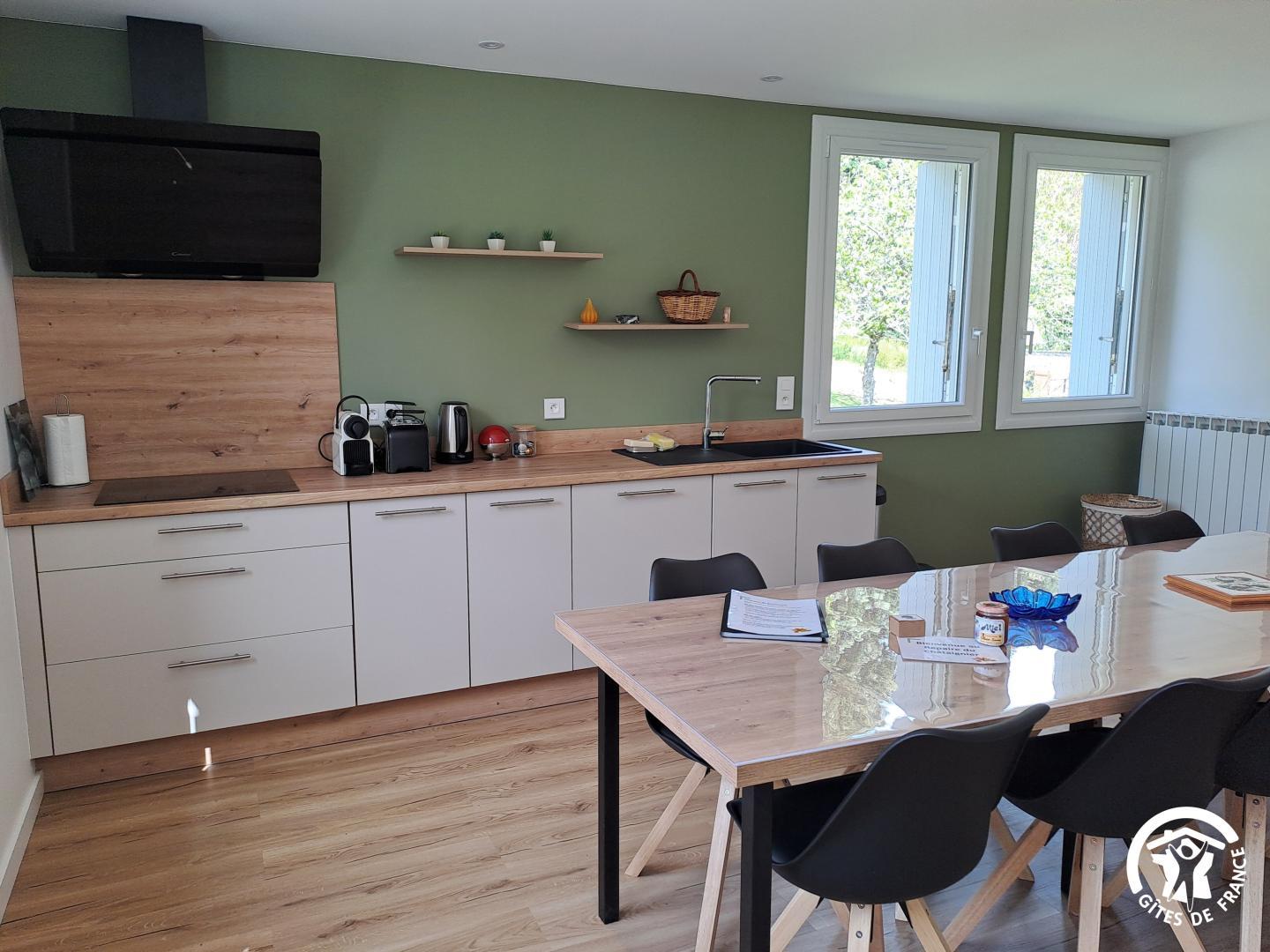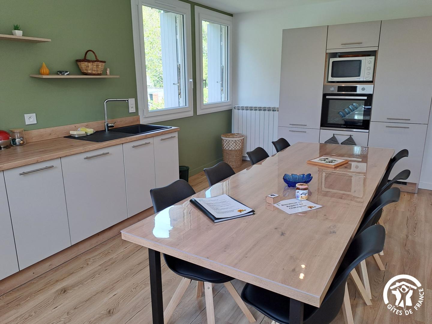 La véranda, climatisée, sert de pièce de transition conviviale avec coin repas, baby-foot, coffre à jouets et une jolie vue sur le jardin arboré. Vous accédez ensuite à une cuisine spacieuse, bien équipée et lumineuse, parfaite pour cuisiner à plusieurs. Le salon, juste à côté, est équipé d’une télévision connectée (Google TV) et d’un poêle à bois (bois fourni), idéal pour les soirées plus fraîches.