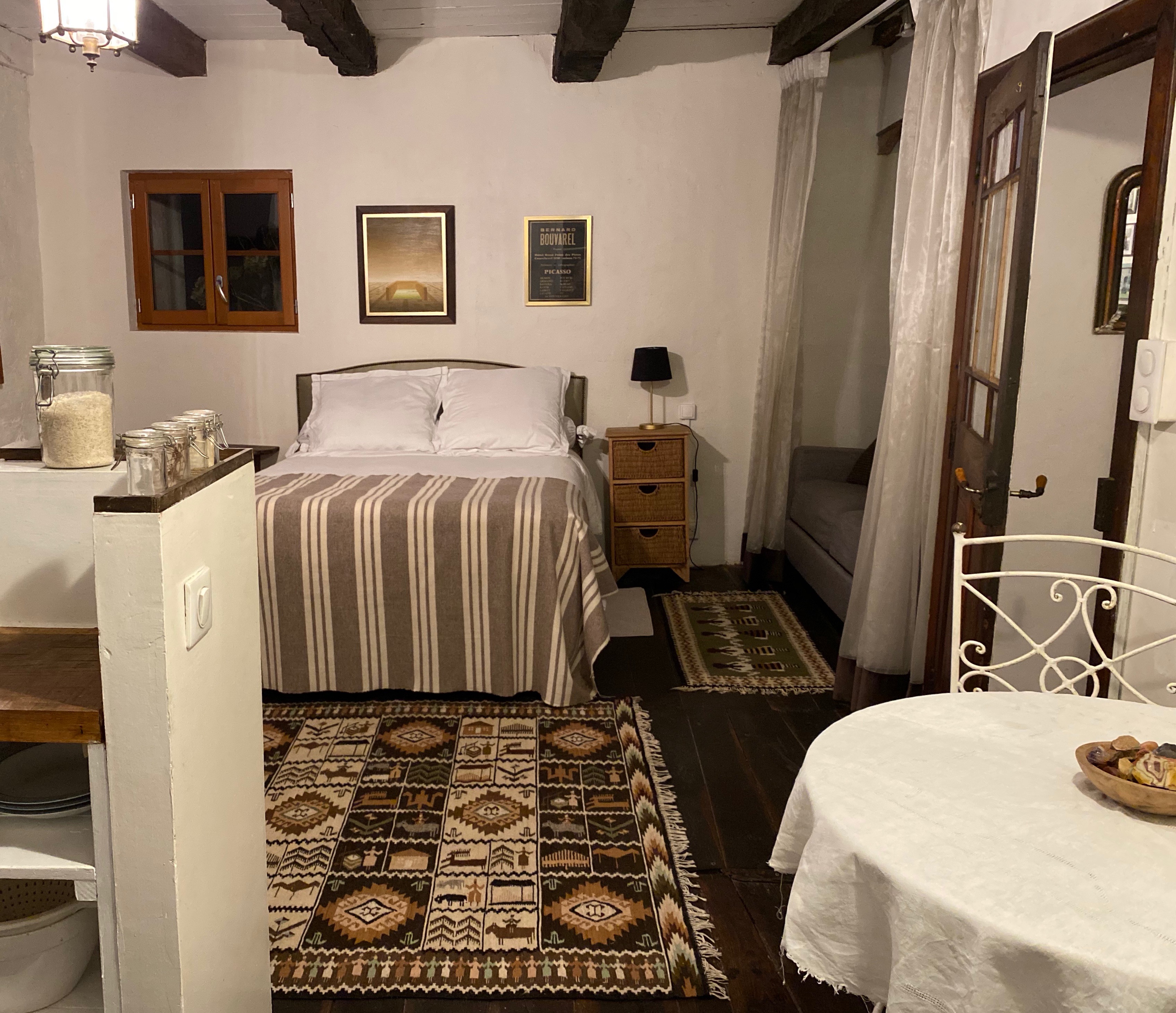 Vous séjournez au rez-de-chaussée d’une petite maison du village. C’est un studio, c’est à dire il y a une pièce ou se trouve : un canapé lit, très confortable pour deux personnes, une alcôve avec un lit simple, un coin salle à manger, une cheminée et une cuisine entièrement équipée séparée par un demi-mur. En face se trouve une salle de bain avec une très bonne douche. La salle de bain est privée.