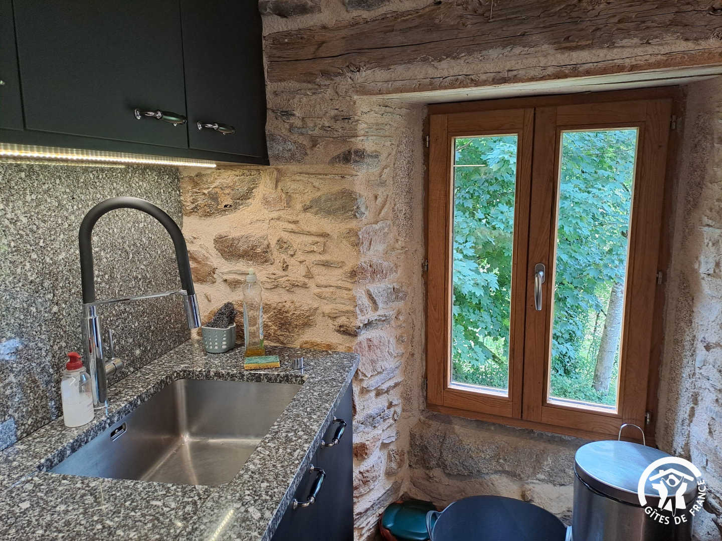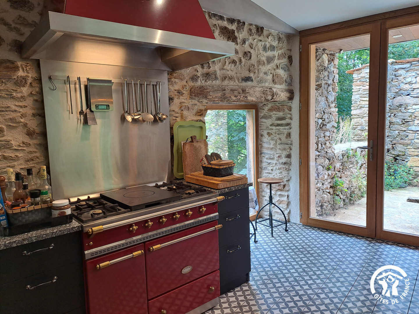 Séjour / Salle à manger avec cheminée, bibliothèque, belle et spacieuse cuisine suréquipée, avec une console centrale en granit du Sidobre et un piano Lacanche. Les musiciens ont la possibilité de jouer du « vrai » piano et ce, même en mode silencieux.