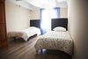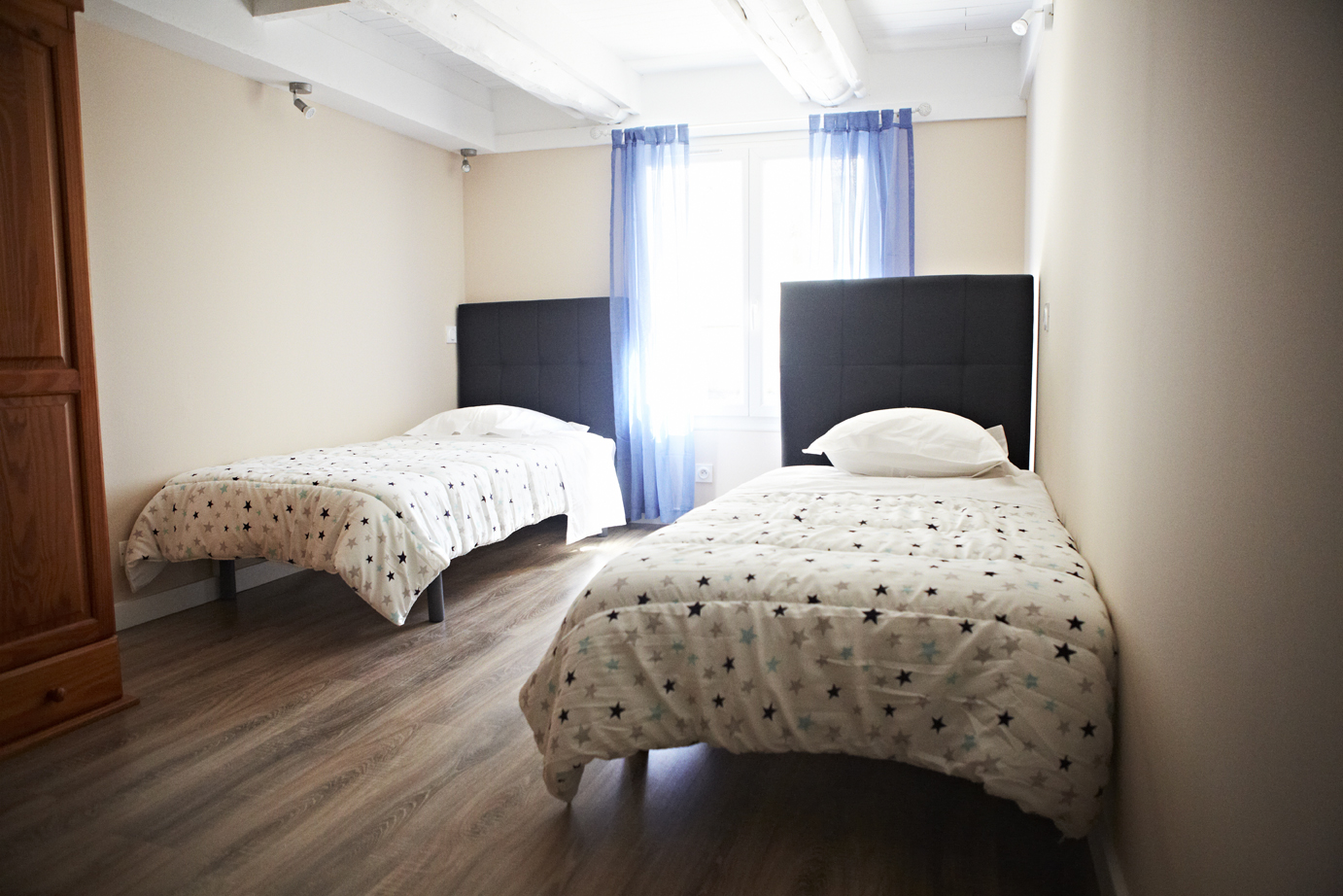Une chambre avec deux lits en 90 et baby foot.