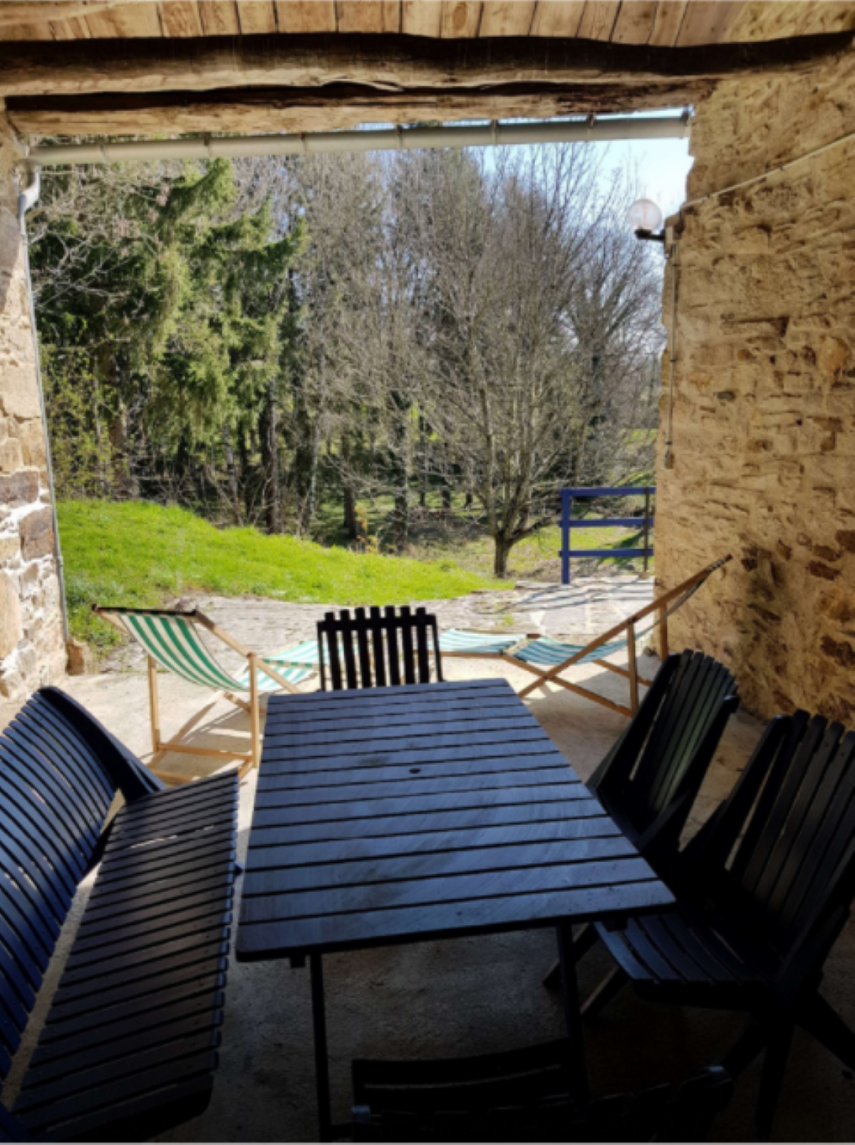 Auvent avec salon de jardin et barbecue.