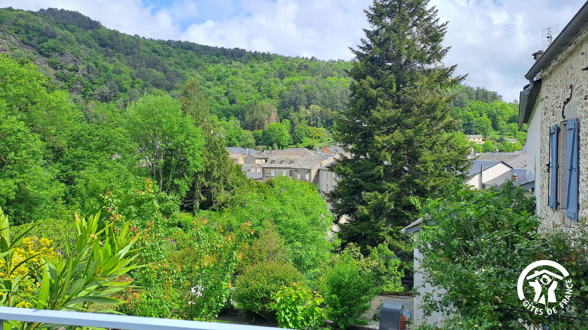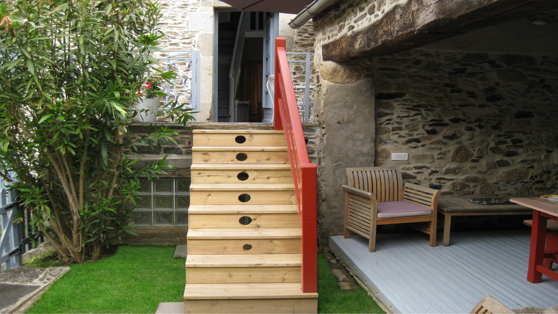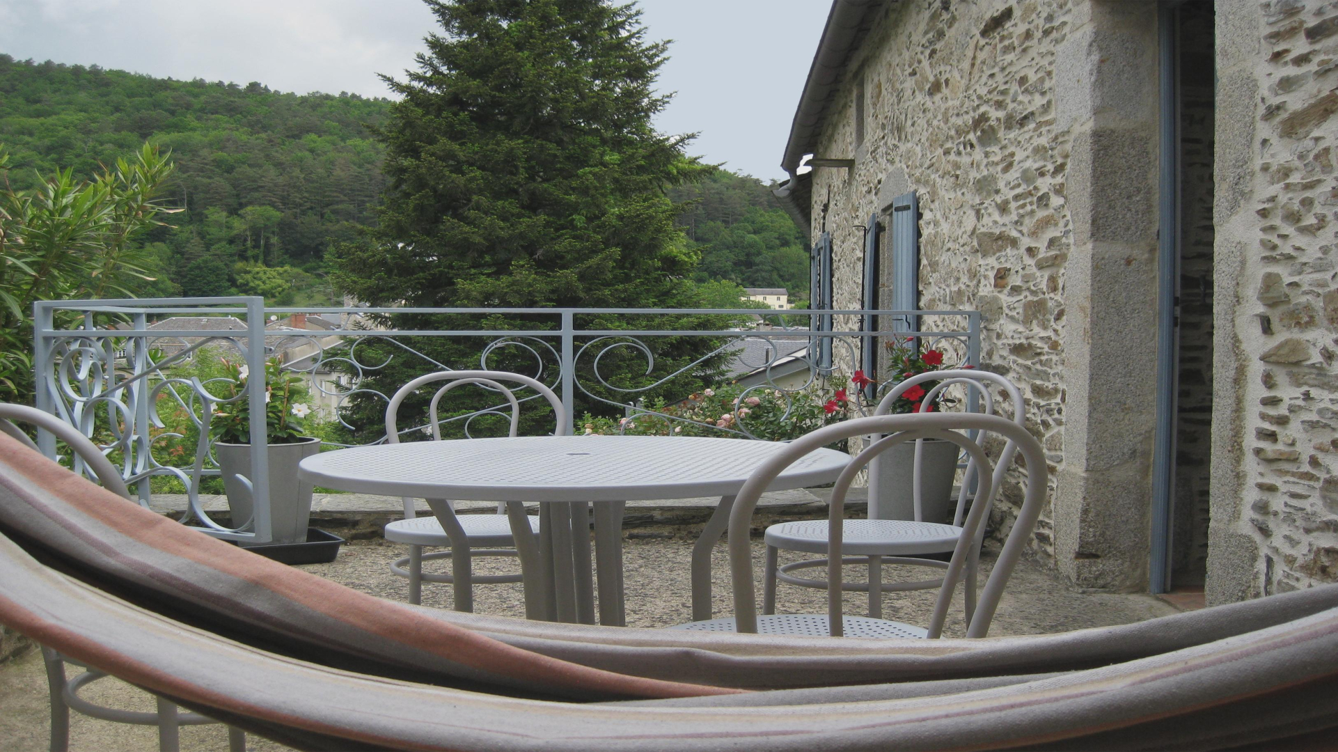 – Terrasse privative de 15m² avec hamac, transats, table ronde, chaises et parasol. Cette terrasse surplombe le jardin du propriétaire et offre une vue dégagée sur le village. Accès à la cuisine d’été et son espace vert par escaliers extérieurs.