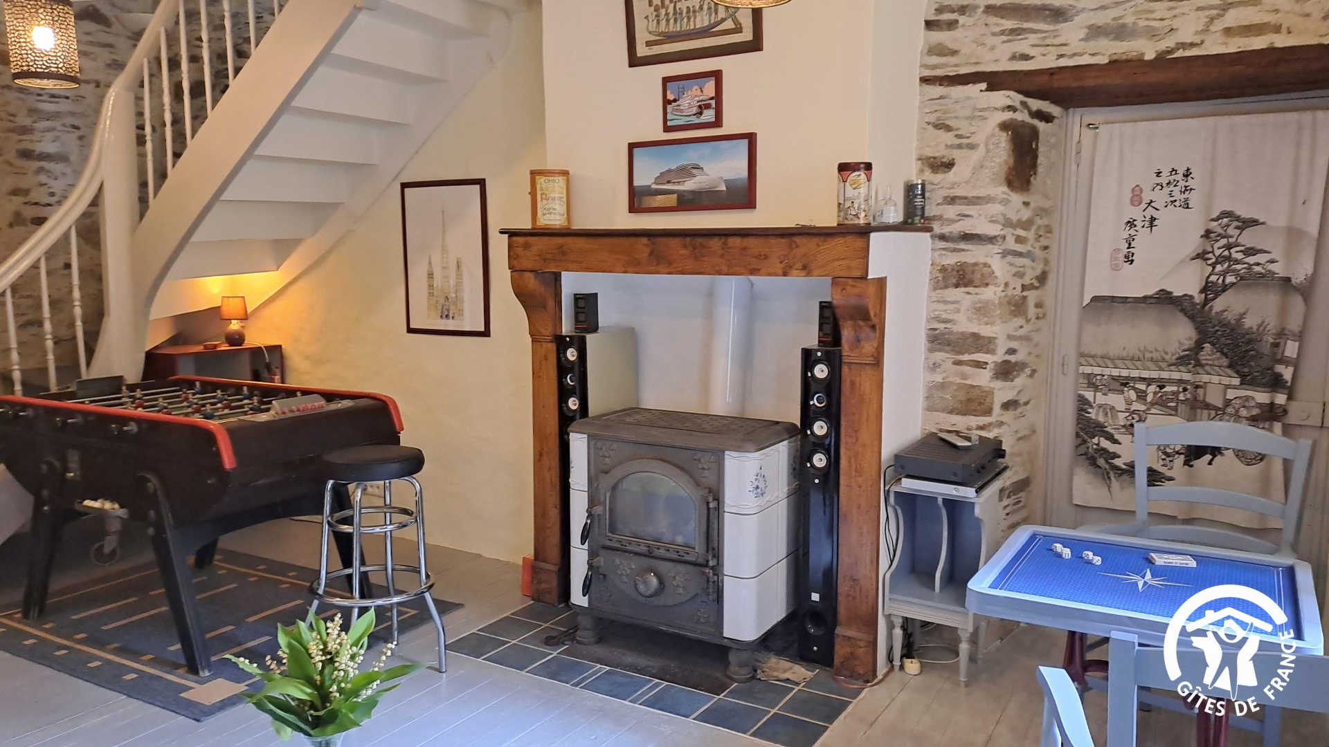 – Espace jeux et détente avec canapé convertible pour un couchage supplémentaire en 140x190cm, table de jeux de cartes/dés, babyfoot, jeu de fléchettes, miroir de plein pied, chaîne Hifi avec lecteur CD ou playlist sur votre Smartphone.