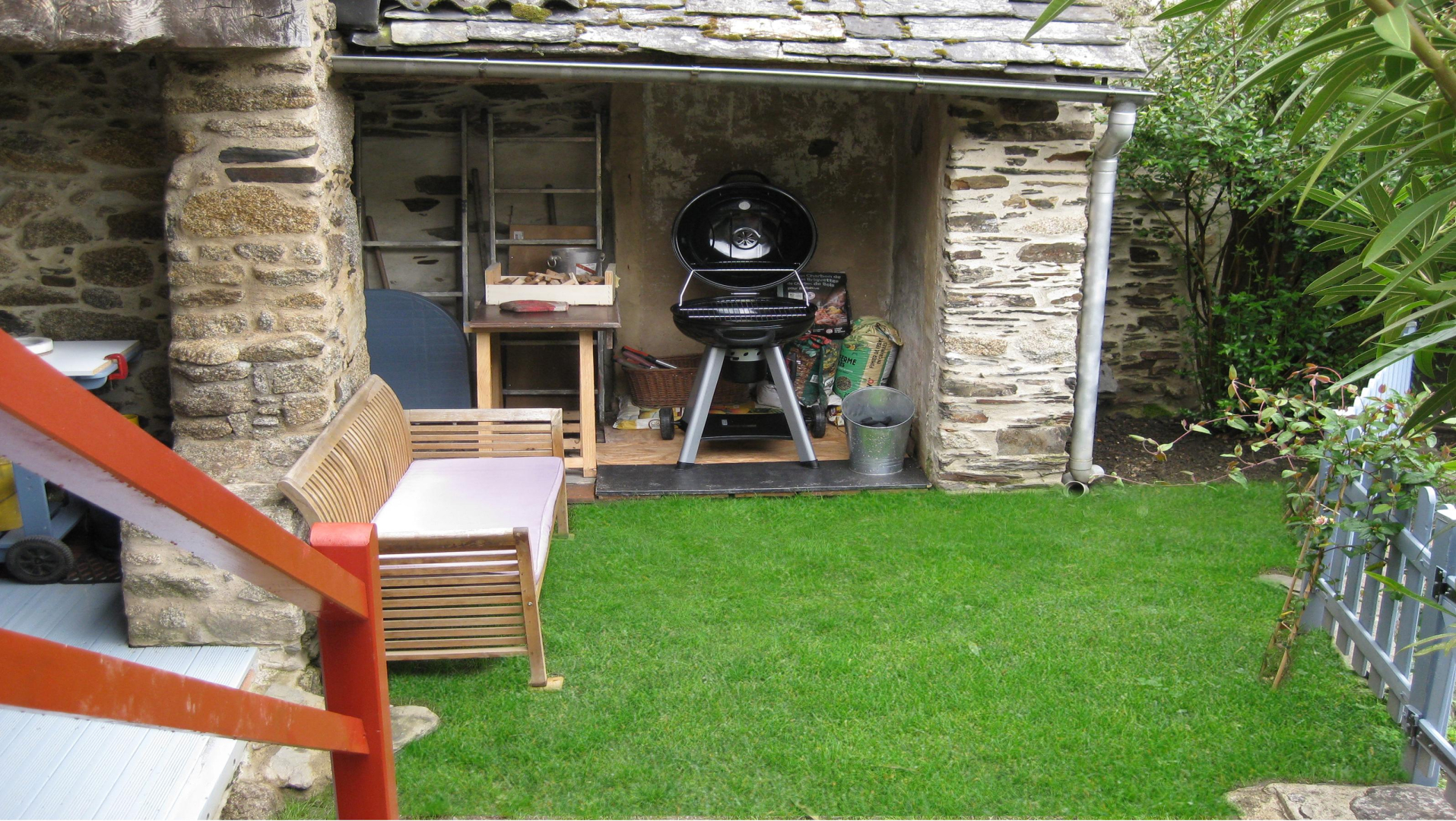 Extérieur : – Cuisine d’été équipée d’une grande table (6 personnes), 2 bancs, fauteuils, réfrigérateur avec compartiment freezer. Devant, un petit espace vert avec un barbecue, fauteuil d’extérieur et place pour les transats.