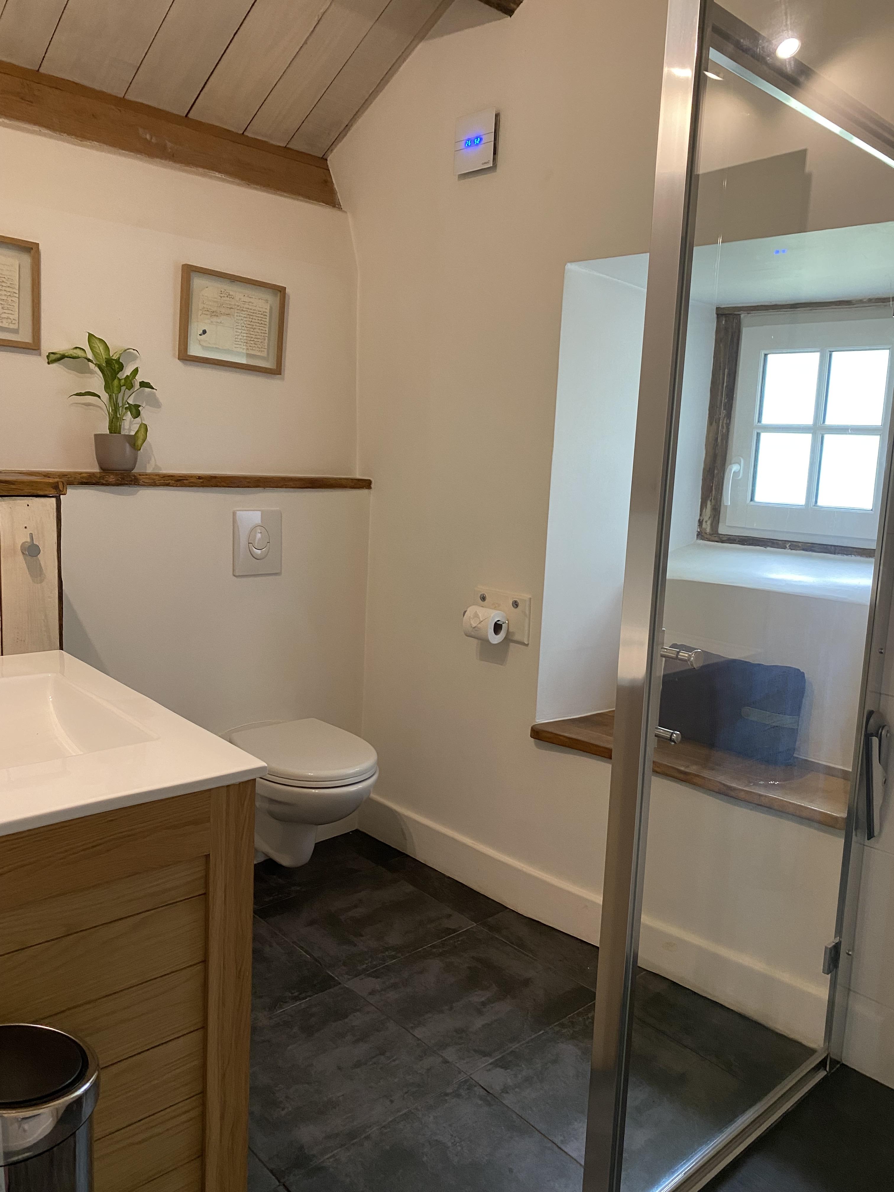 La douche a une grande cabine de 90cm avec un colonne de douche thermostatique et un sèche-serviettes.