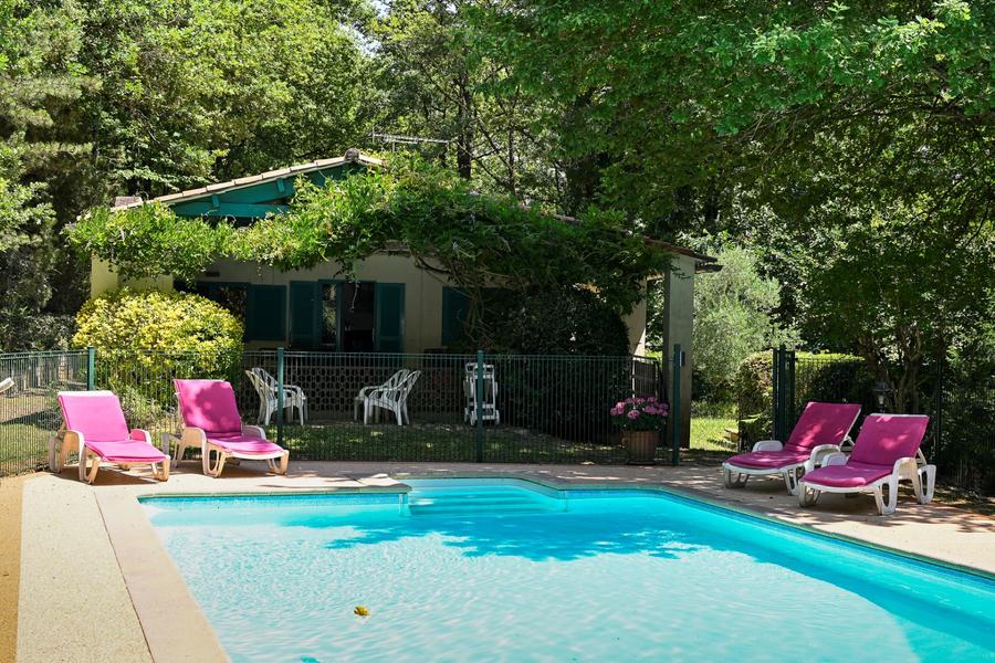 Chalet avec piscine privée sur un terrain arboré dans le Parc Régional du Haut Languedoc. 1 chambre.