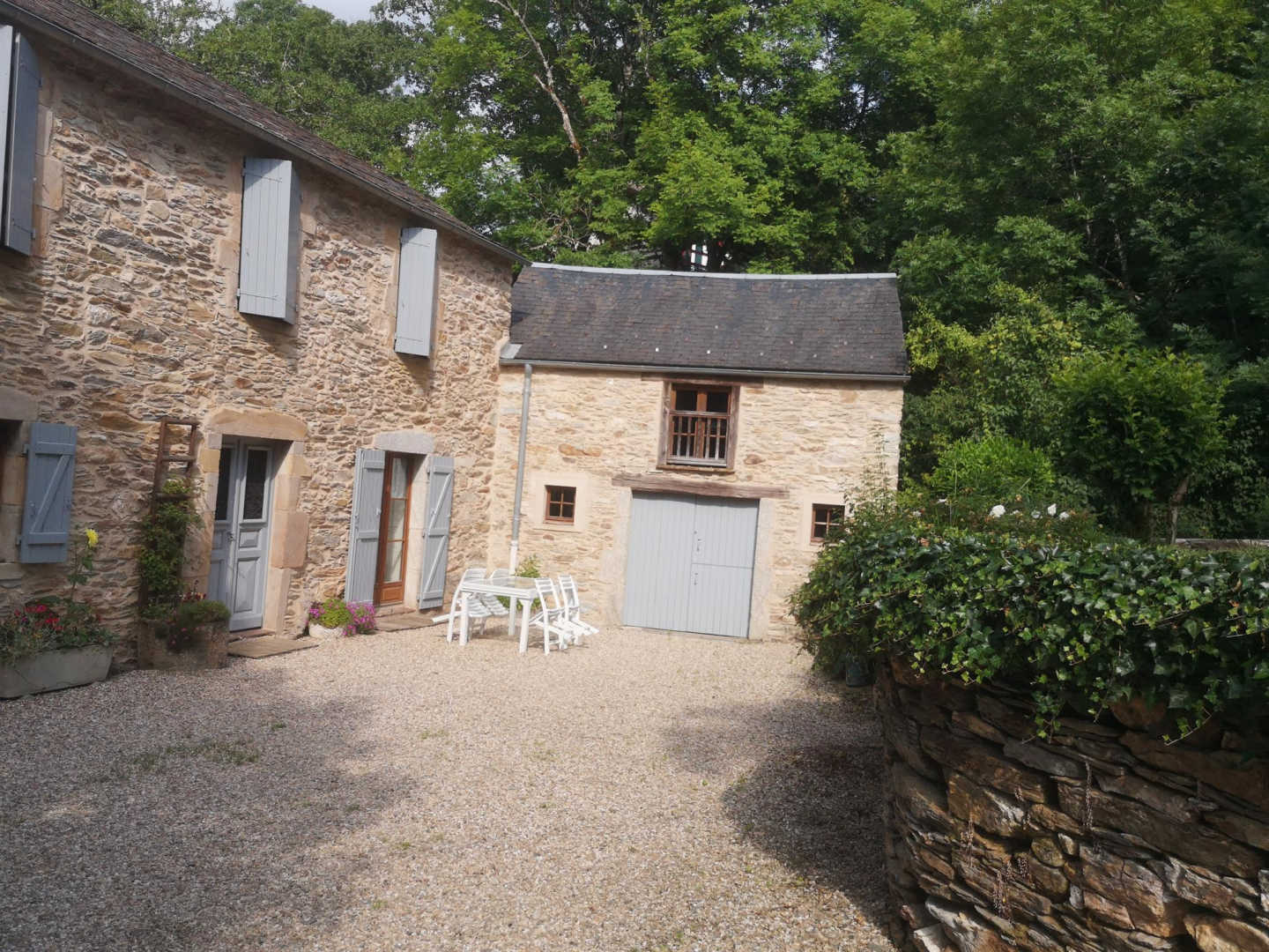 Gîte indépendant ouvrant d’un côté sur la cour et le jardin (portique), et de l’autre sur la terrasse dominant la cascade. Au rez-de-chaussée : grand séjour avec coin-salon et cuisine, salle d’eau avec wc, buanderie. A l’étage : trois chambres (quatre lits doubles), salle de bains, douche, wc. Chauffage central fuel. Téléphone, wifi.