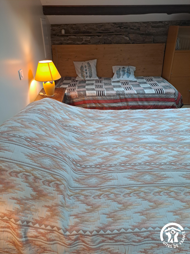 Le coin nuit se trouve en mezzanine (16m²), on y accède par un escalier en bois. S’y trouvent un lit double en 140×190 et un lit simple en 90×190. Lit bébé sur demande.