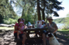 Une pose repas ombragée au milieu des rochers en bordure du lac.