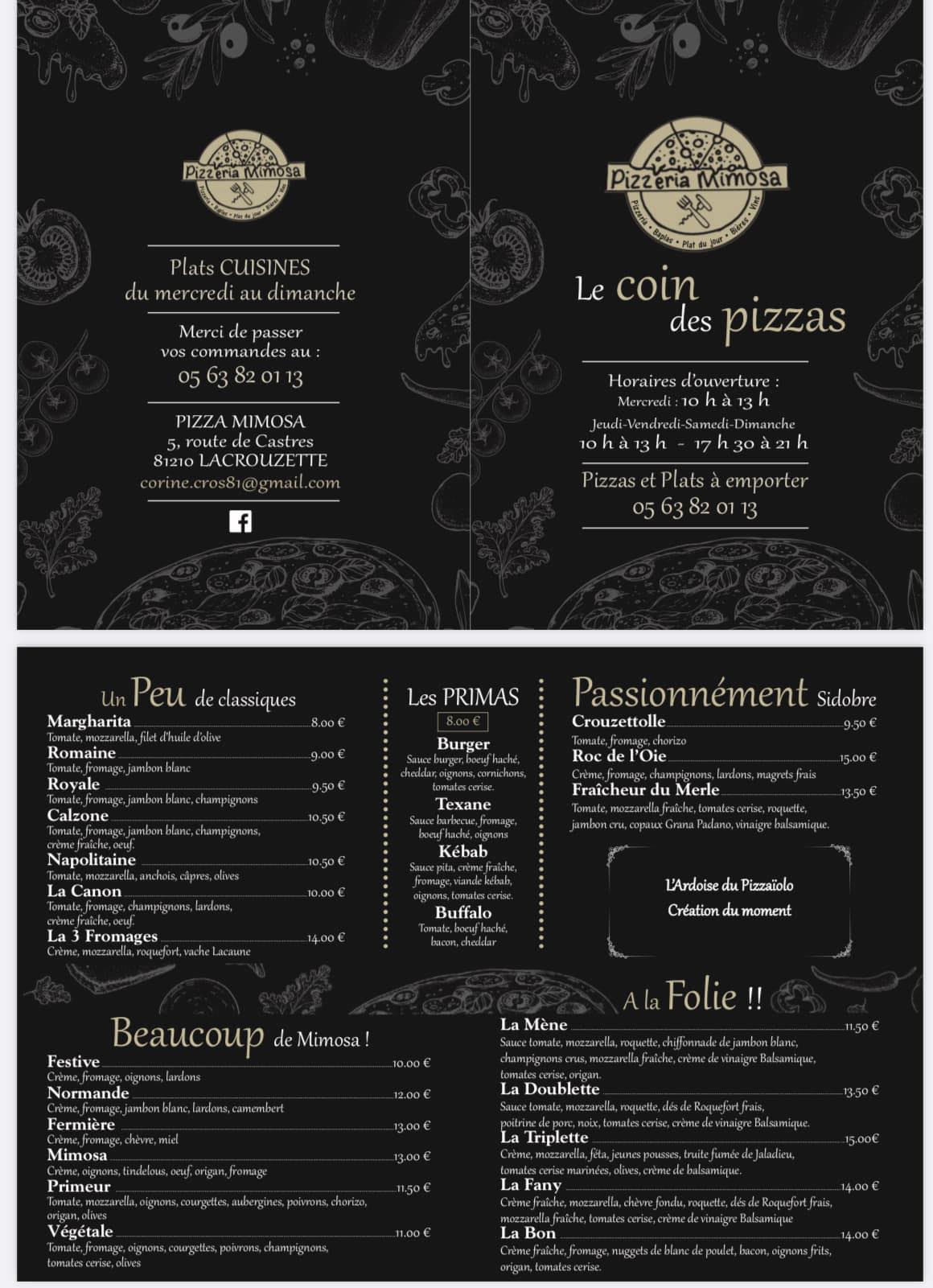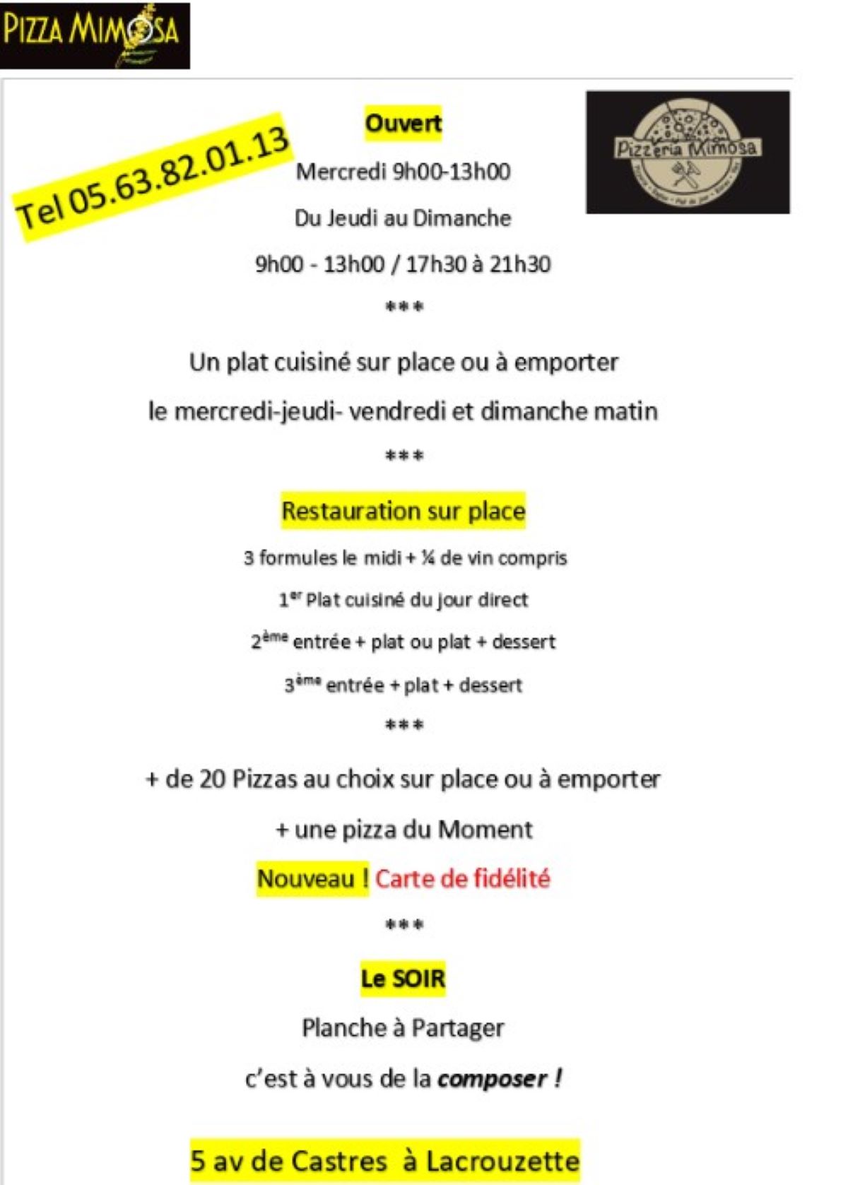 Pizza mimosa, c’est + de 20 pizzas mais également menu du jour le midi jeudi vendredi et dimanche