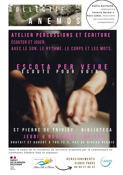 Ecouter et jouer, avec le son, le rythme, le corps et les mots. Dans le cadre de la résidence de territoire « Ecoute pour voir » du collectif Anemos, proposée par la communauté de communes Sidobre Vals et Plateaux.