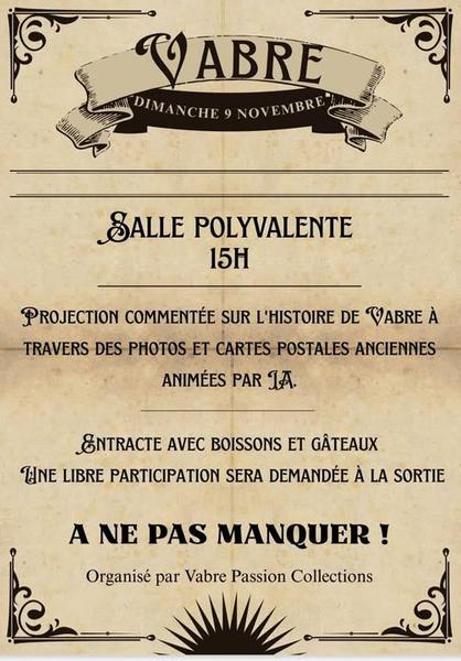 On vous attends nombreux découvrir Vabre comme vous ne l’avez jamais vu ! Projection commentée sur l’histoire de Vabre à travers des photos et cartes postales anciennes animées par IA.