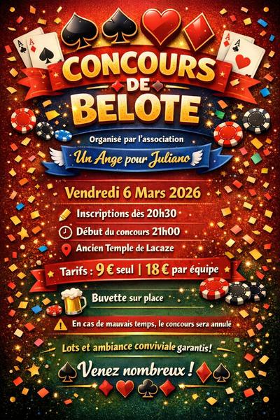 L’Association Un Ange pour Juliano organise son concours de Belote à l’Ancien Temple de Lacaze, les inscriptions se font a partir de 20h30 et début du concours a 21h00,